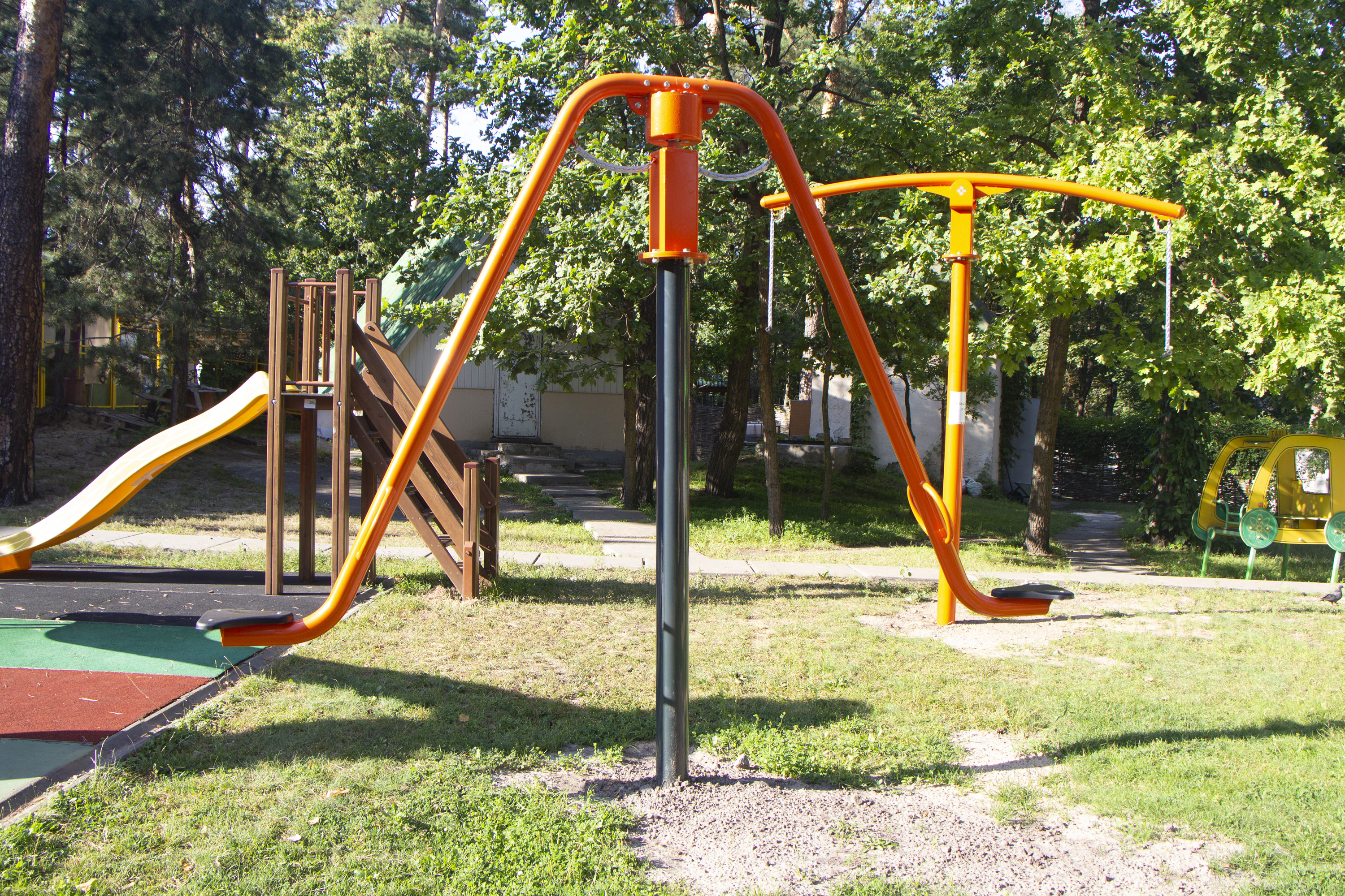 The carousel-balancer consists of a metal support and the very structure of the carousel, which moves around its axis and according to the principle of the balancer, and two single seats. The product is made of a strong metal profile that can withstand even the most intense loads. The seats are made of plastic. Bolted connections are galvanised and have protective plastic caps. Powder paint is applied to the metal elements. The coating is safe for health and protects the product from burning, adverse weather conditions, mechanical damage, and corrosion.