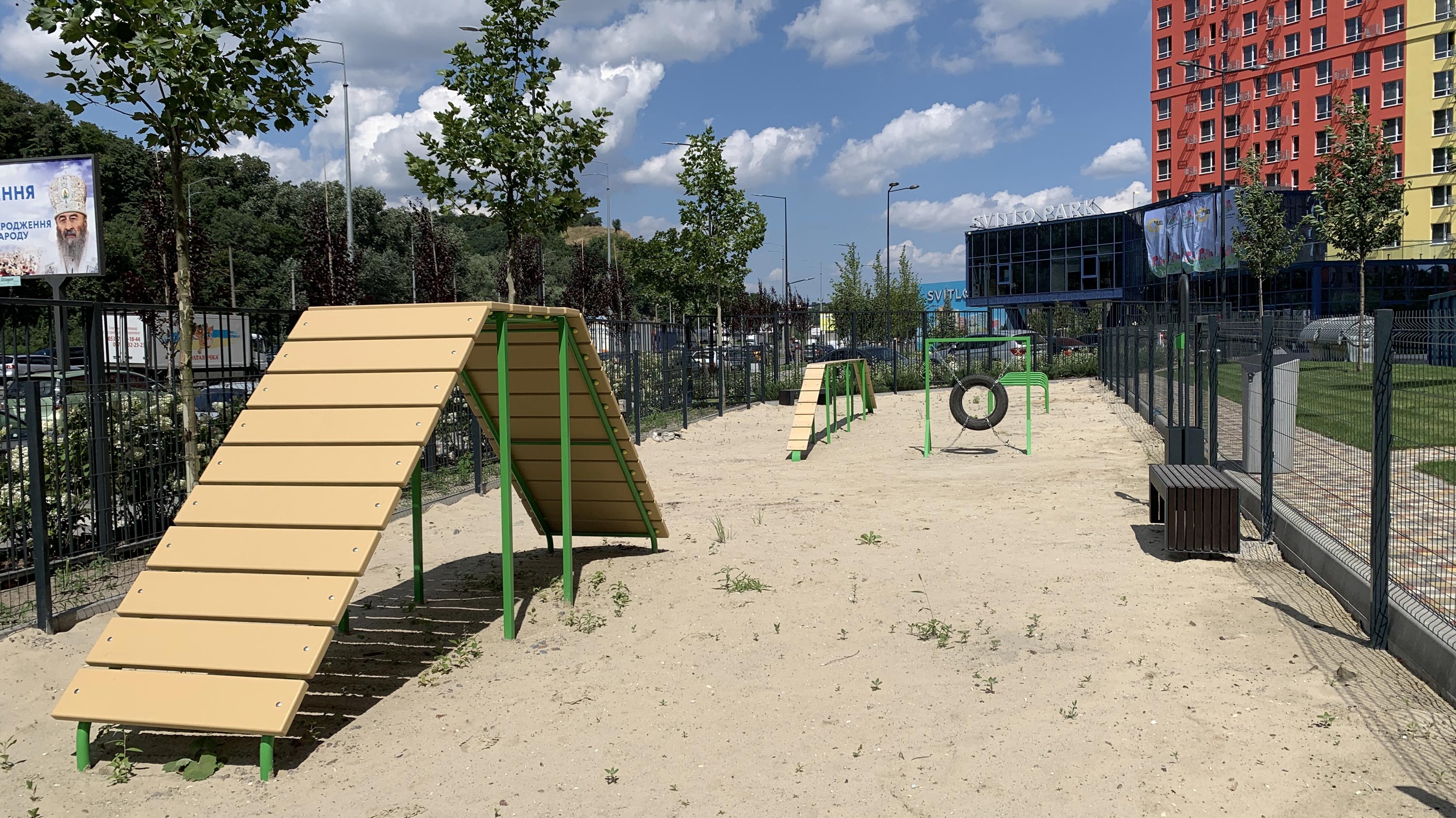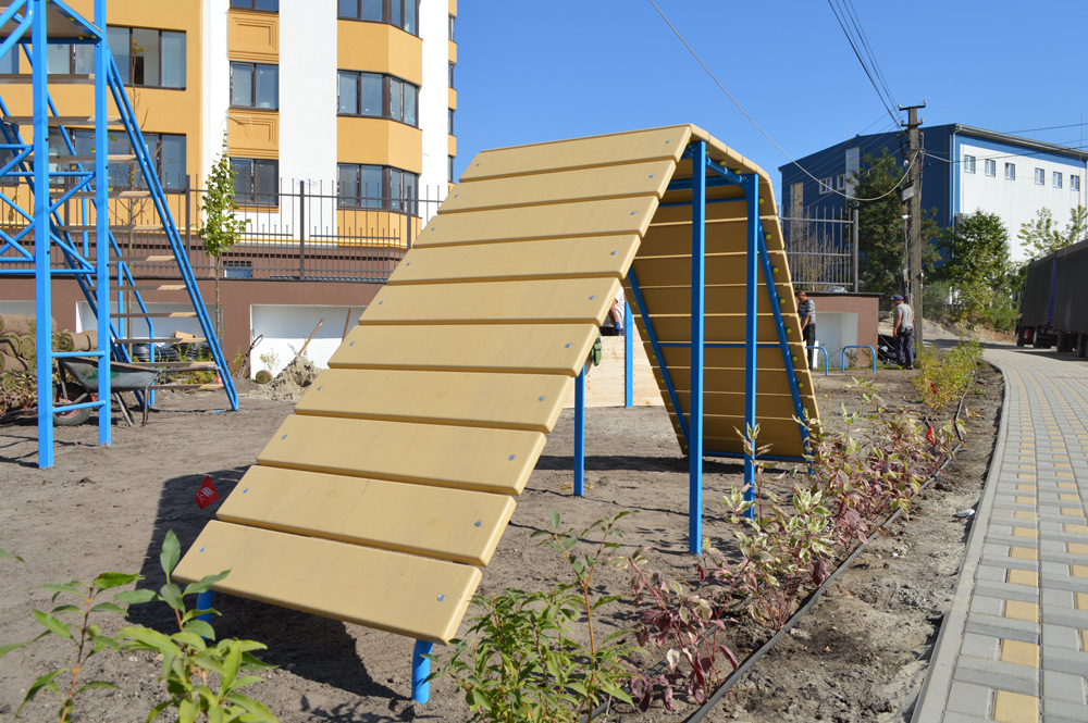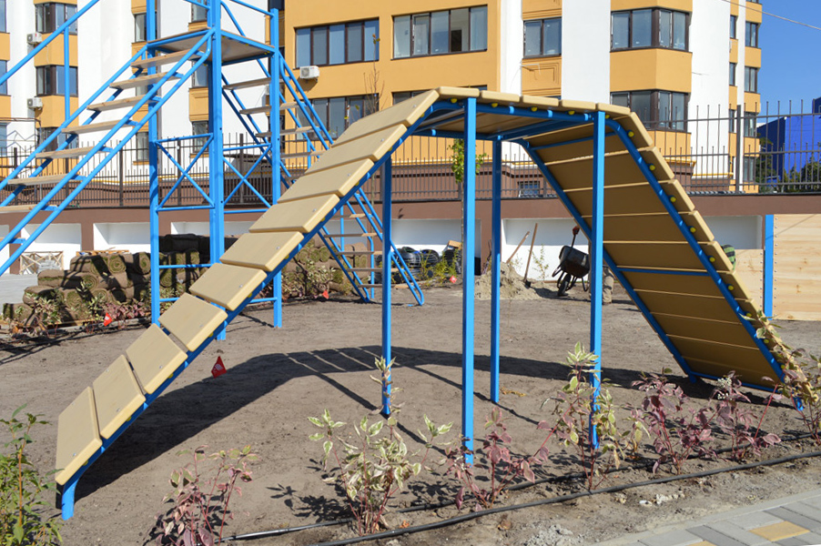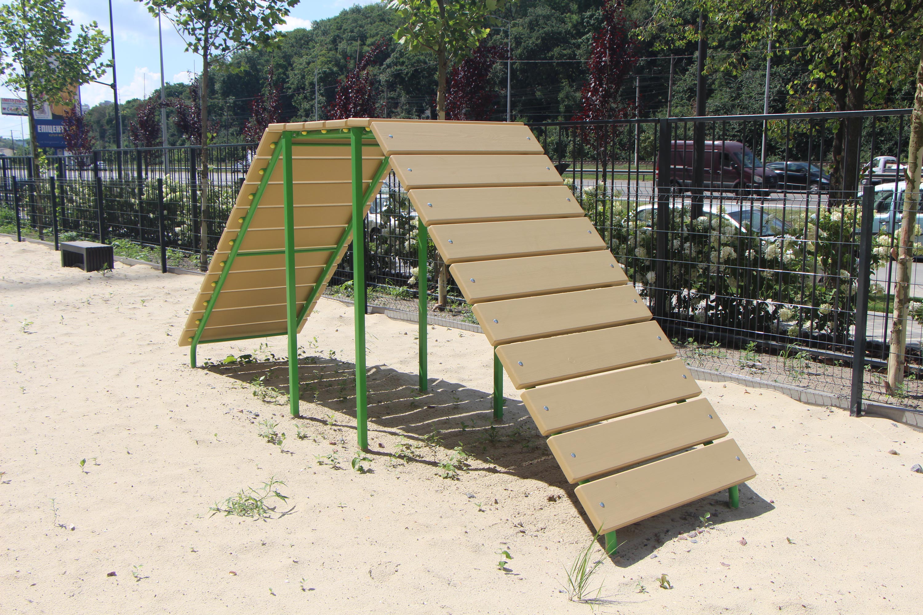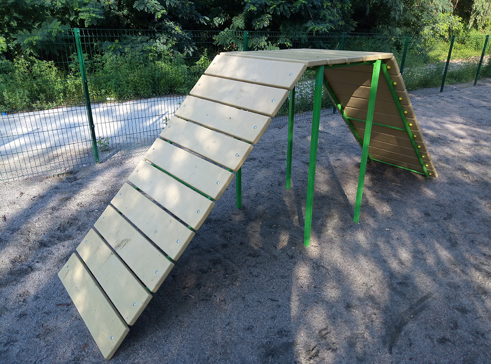 This structure consists of wood and metal. Wooden elements are securely fixed on a stable metal inclined stand. The structure is covered with a special paint that protects against adverse weather conditions: rain, snow, and ultraviolet rays. Our company uses exclusively environmentally friendly materials. The main colour of the painting is blue. It’s suitable for training any breed and any age of dog at any time of the year.