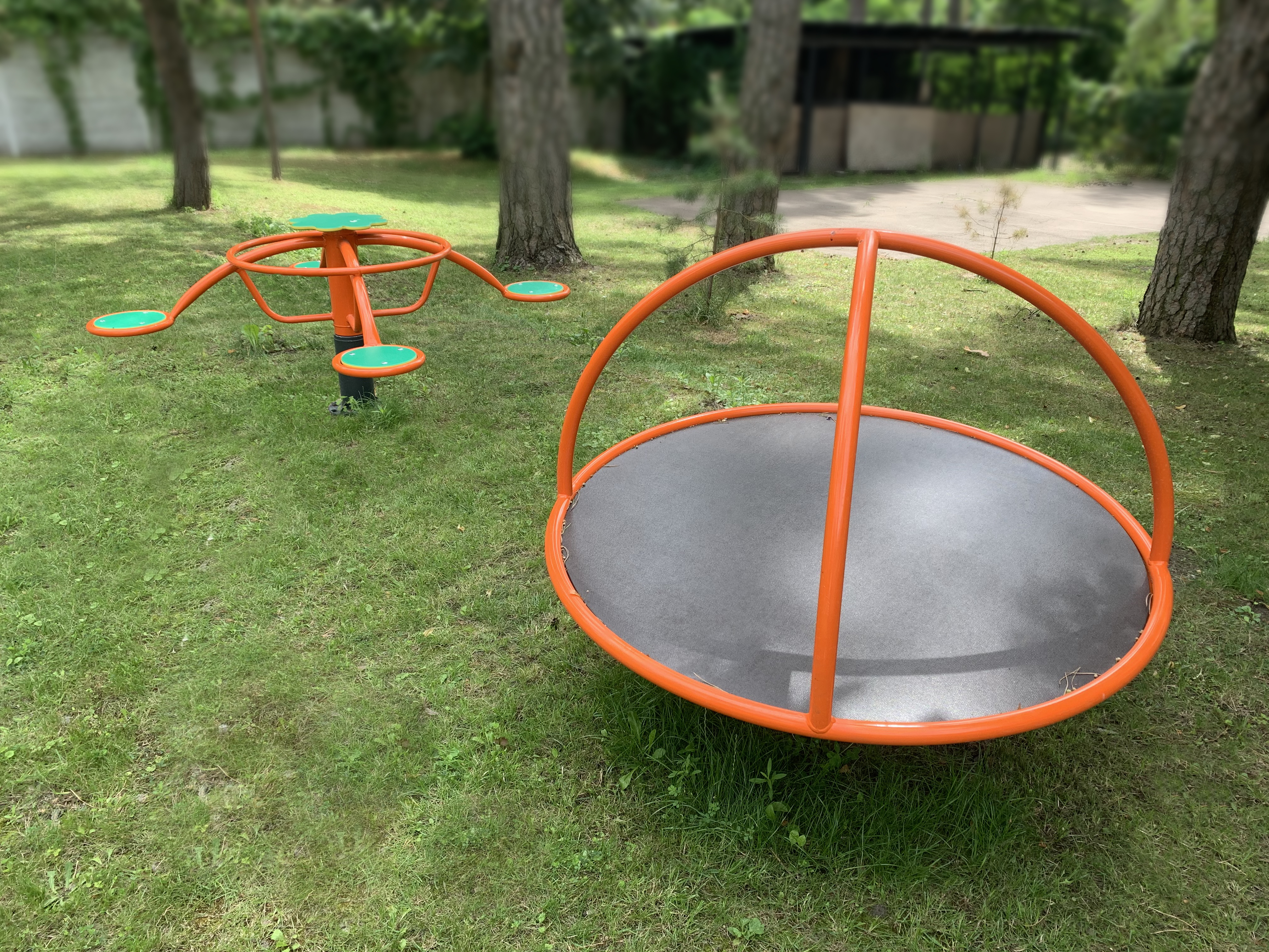 Bolts and other fastening elements have protective anti-vandal caps made of plastic. The carousel rotates on the shaft thanks to radial and radial thrust-type bearings. Metal caps protect bearings from corrosion and moisture. The equipment is covered with powder paint. The coating is safe for use by children.
