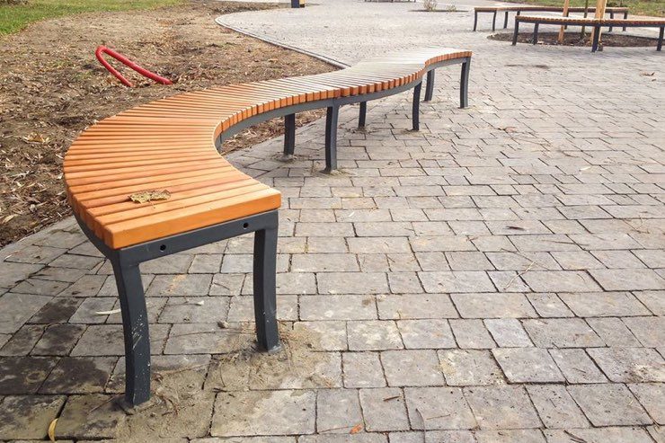 For production, we use a high-quality steel profile that can withstand a significant load. The durable metal frame is powder-coated, which is resistant to adverse weather conditions, temperature changes, burnout, and corrosion. This model of the LP012 bench has a shape curved along the radius, which allows you to sit with your company as a long chain in the form of a snake or a circle. A wooden structure for recreation can be installed in places of public recreation, private houses, and cottages.