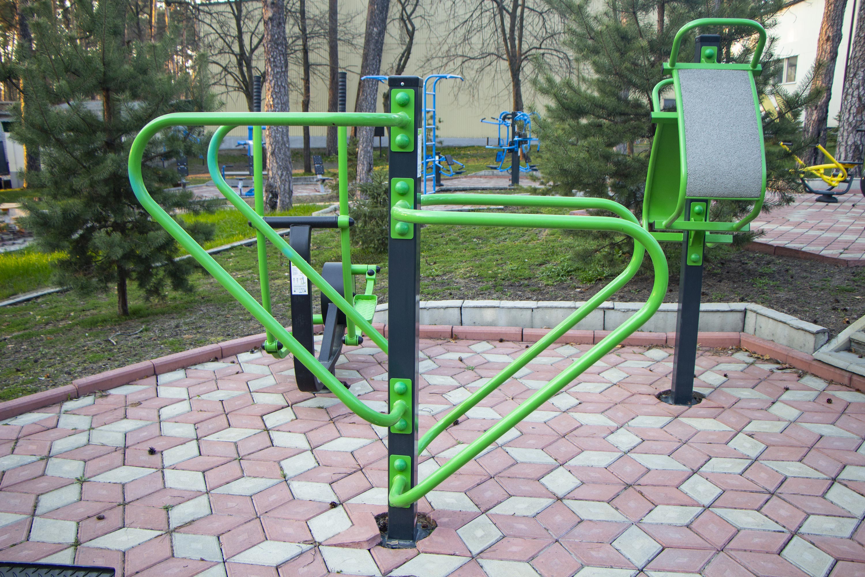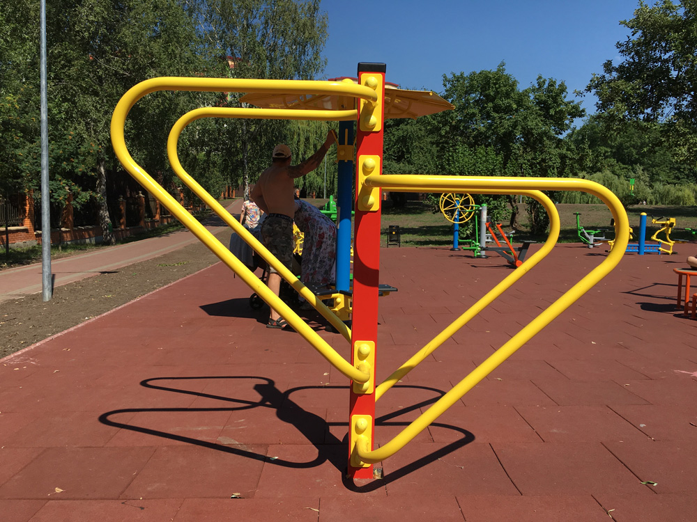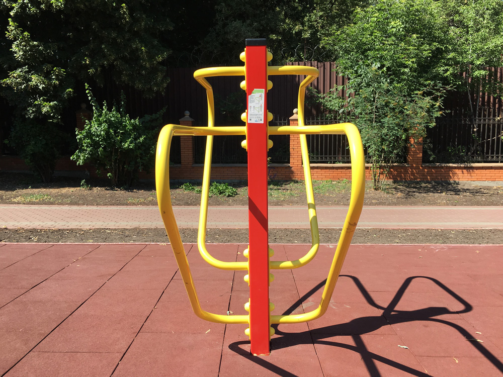 This machine is aimed at working out your abs, which is extremely important for your health. Strong Abdominal muscles improve the digestion process and the work of internal organs. The equipment is double-seat and lets two athletes do exercises at the same time, not disturbing each other. They can train in the fresh air because the design of the machine gives you the possibility to place it outdoors.