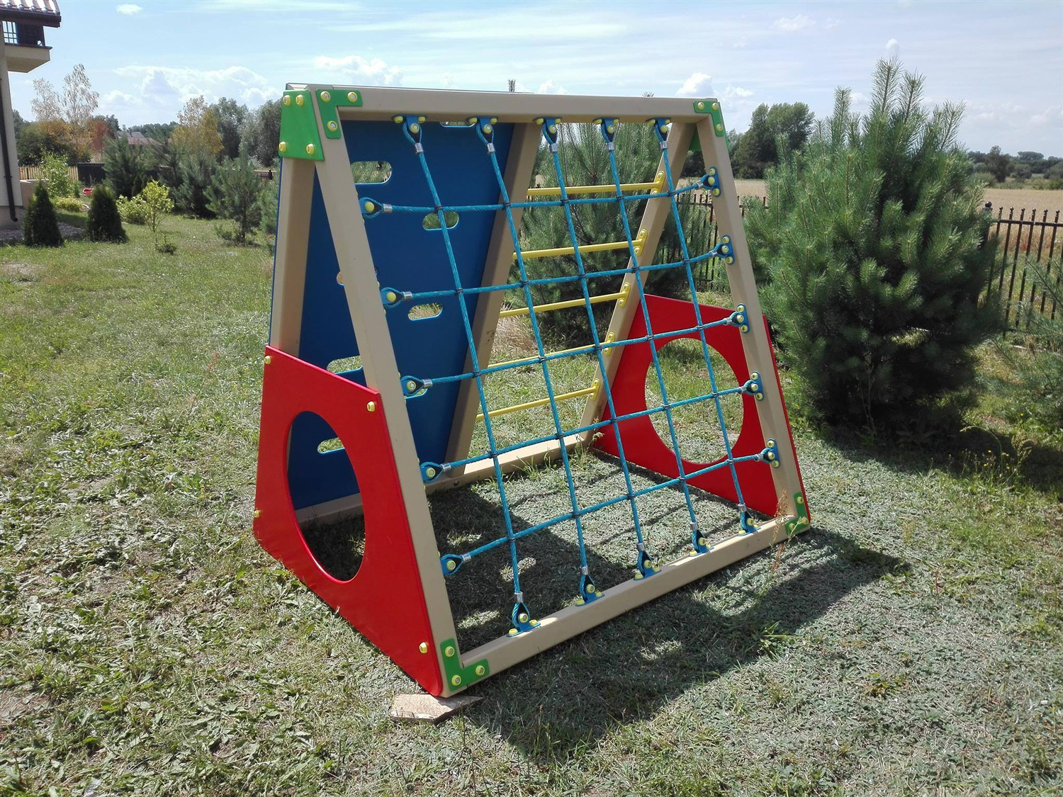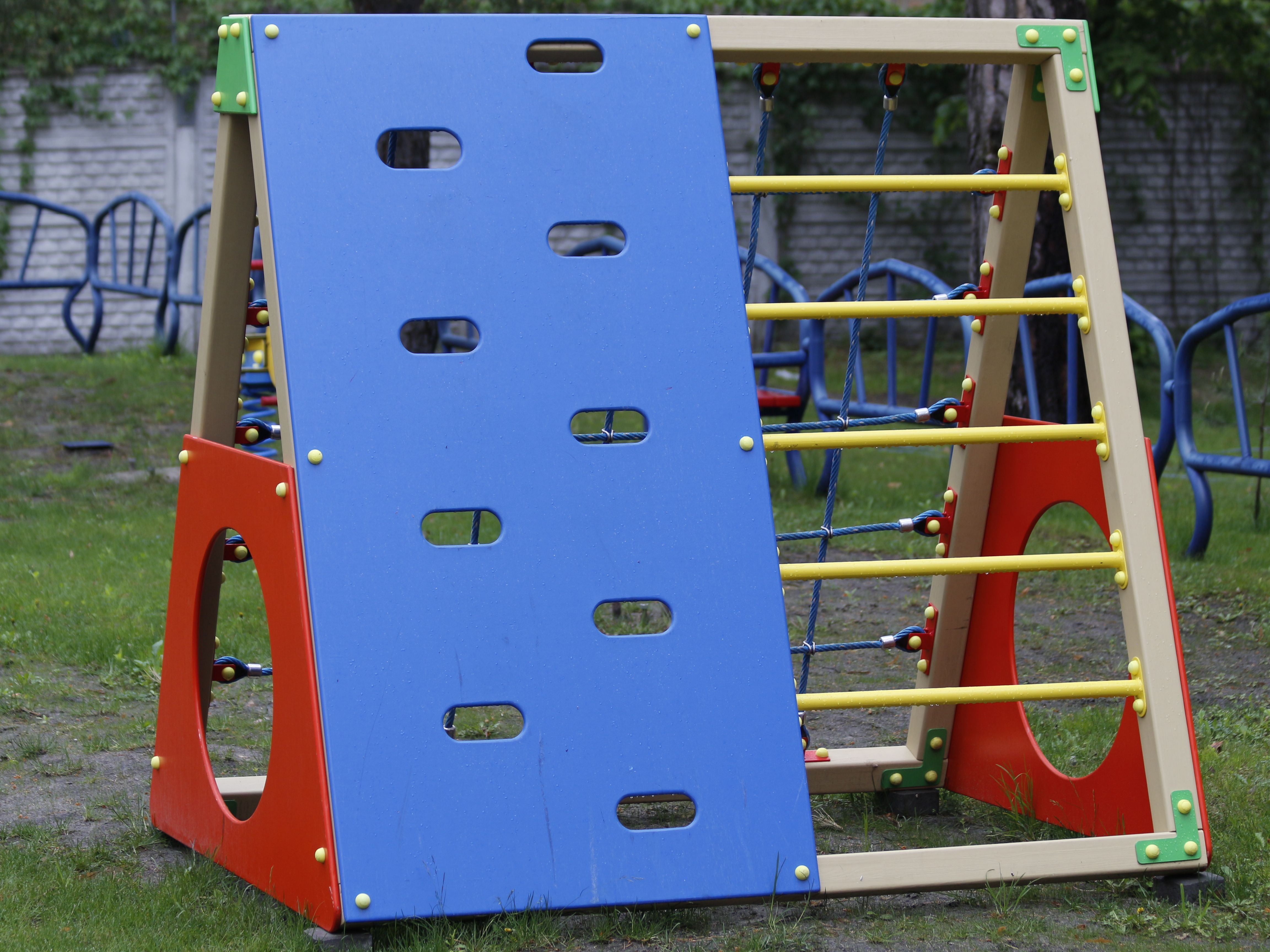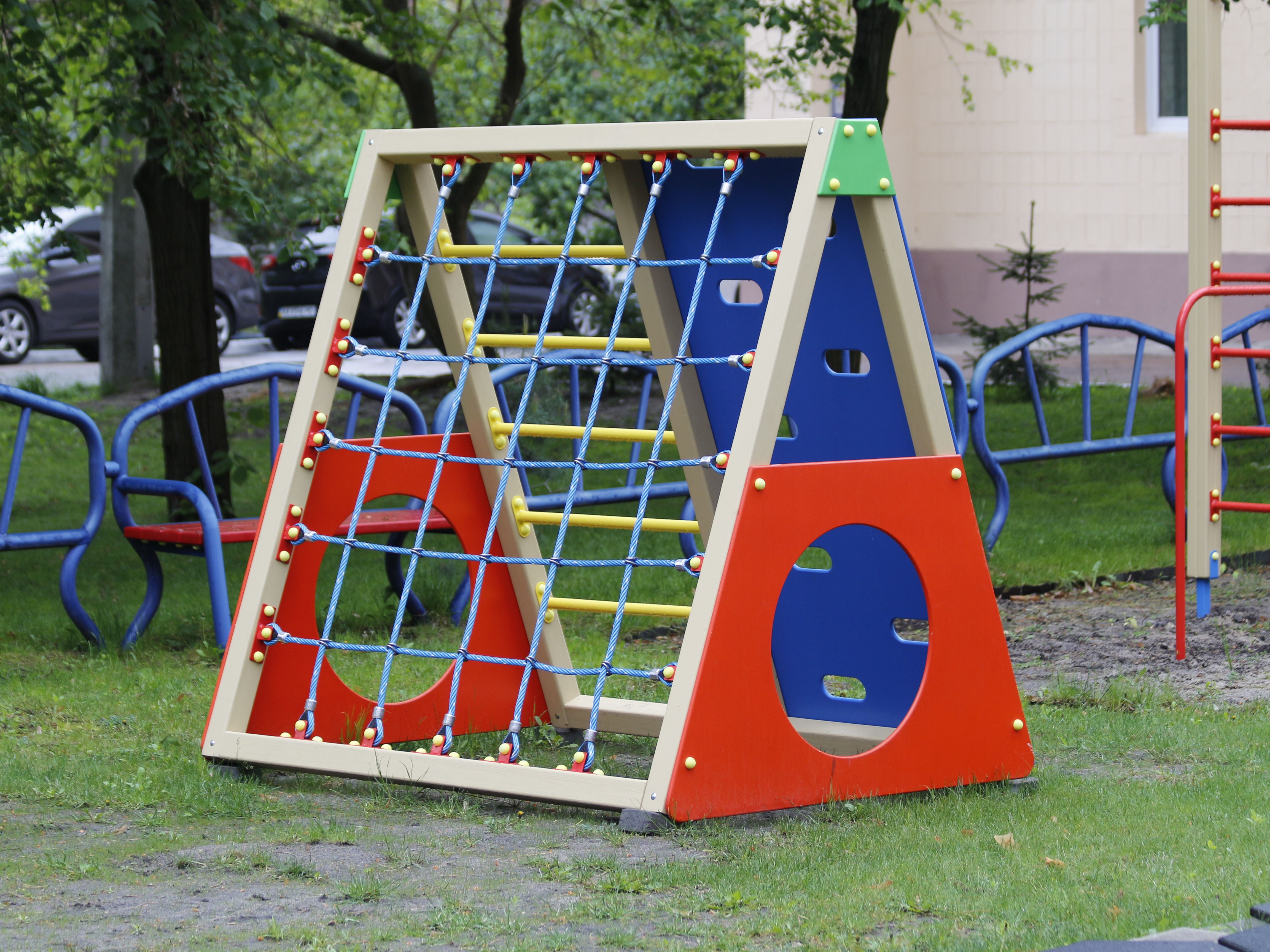 The game gymnastic complex "Web" is made in the form of a triangular pyramid. The strong metal frame is designed for heavy loads, the parts are reliably welded together into a single structure. Water-based acrylic paint is applied to the equipment, metal elements are covered with powder paint. The coating is safe for use by children.