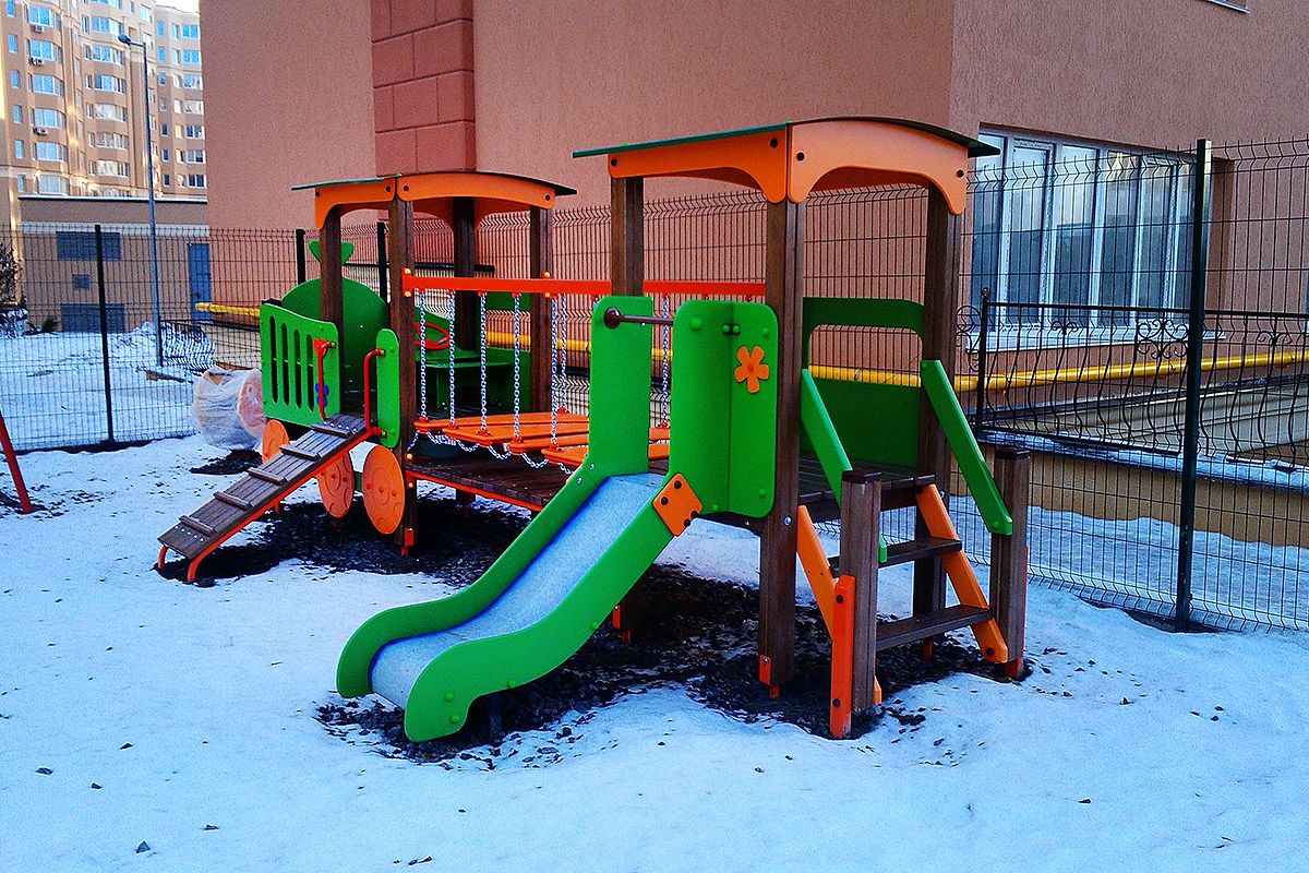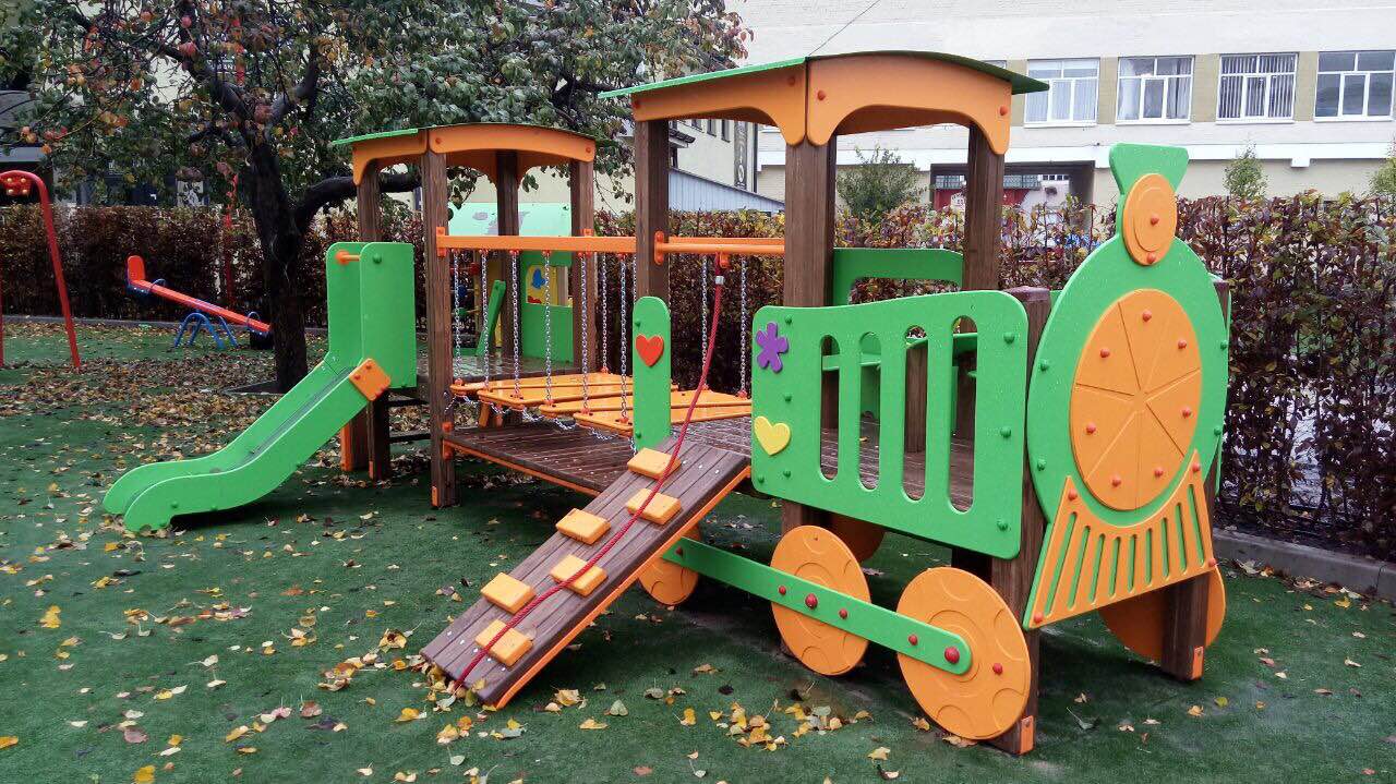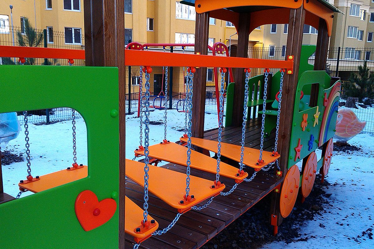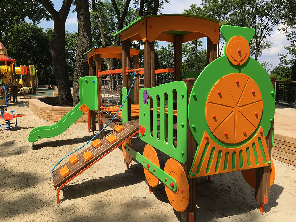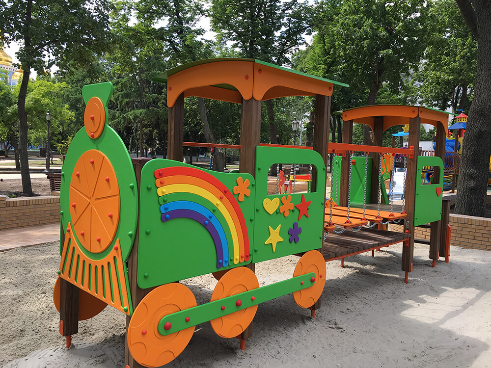 Паровозик имеет лесенку для подъема и спуска, и мостик по которому малыши смогут попасть к вагончику. Вагончик в свою очередь располагает горочку, по которой детишки смогут спуститься.