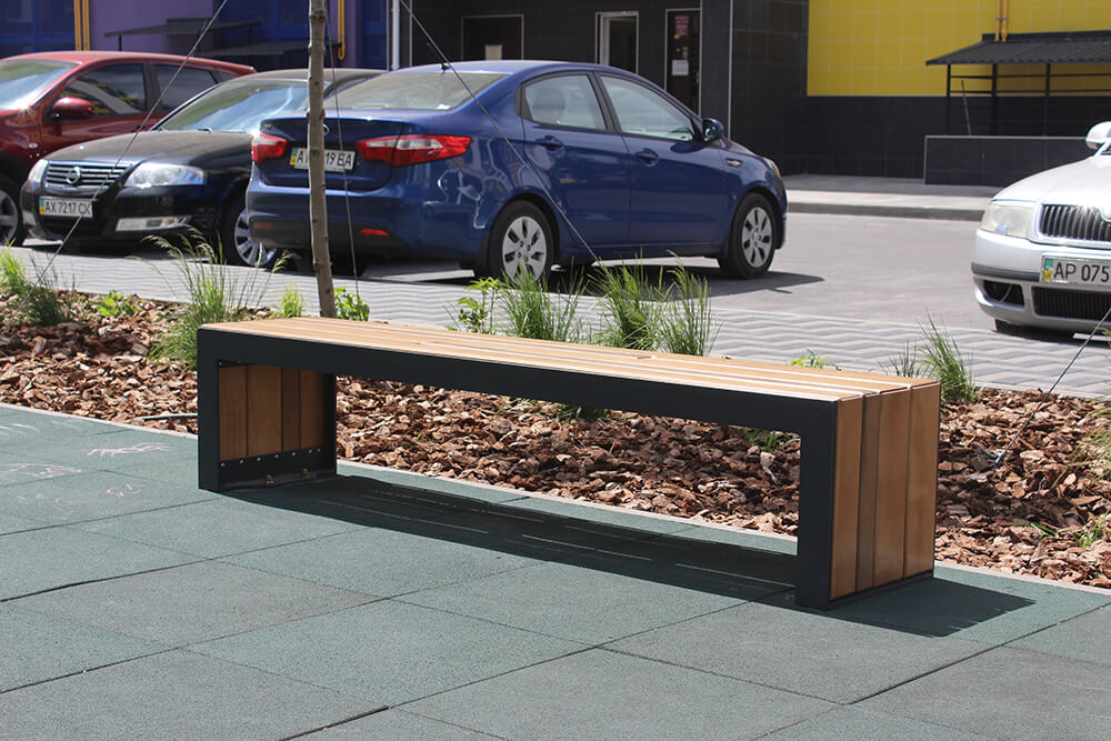 The bench is made of a high-quality steel profile that can withstand 300 kg of load and wood. Metal parts are painted with powder paint and the wooden part - with several layers of varnish, which prevents the ageing of the wood, blocks the development of corrosion and doesn’t allow moisture to pass through. The bench is installed by concreting or screwing.