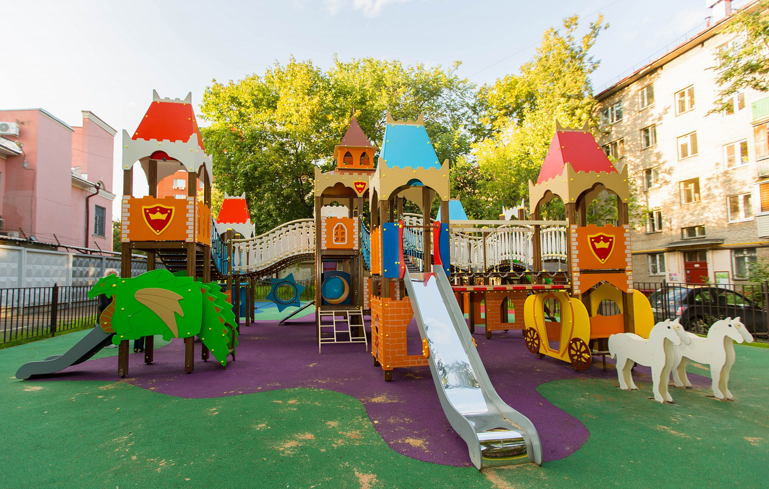 The "Fairytale" game complex has a few parts with small towers and a big one, which are connected by bridges. This playground is equipped with slides, a wall, and other staff, in which kids like to play. The game complex is monumental and surely will be memorised by children. It definitely helps parents send their sons and daughters to breathe fresh air.