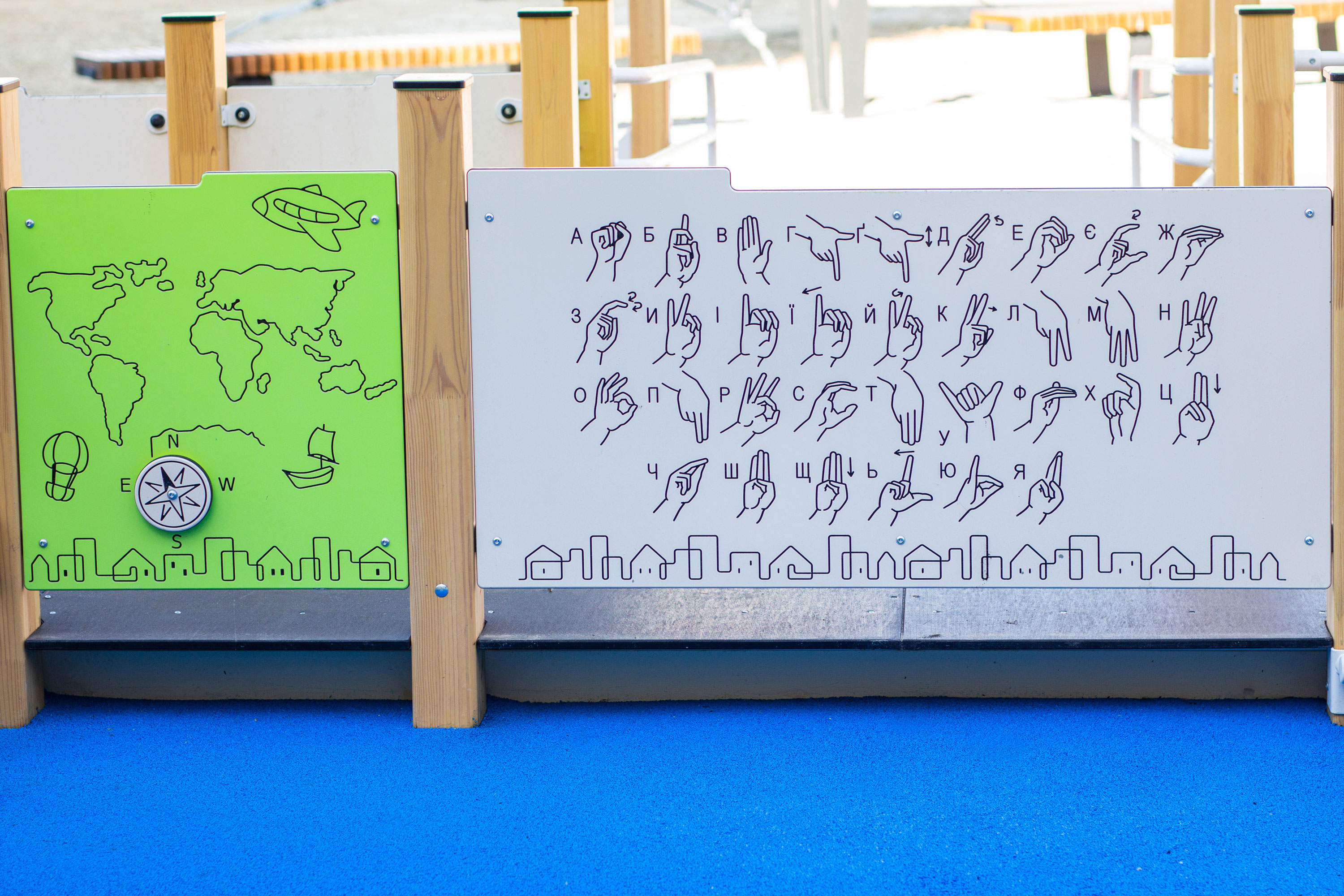 The railings, with which the play complex is equipped on two sides, are made of a metal pipe. Stainless steel stuff has protective plastic plugs and caps. There are such game panels for the entertainment and development of children: Braille panels, puzzles, clocks, sweets, world maps, labyrinths, and much more.