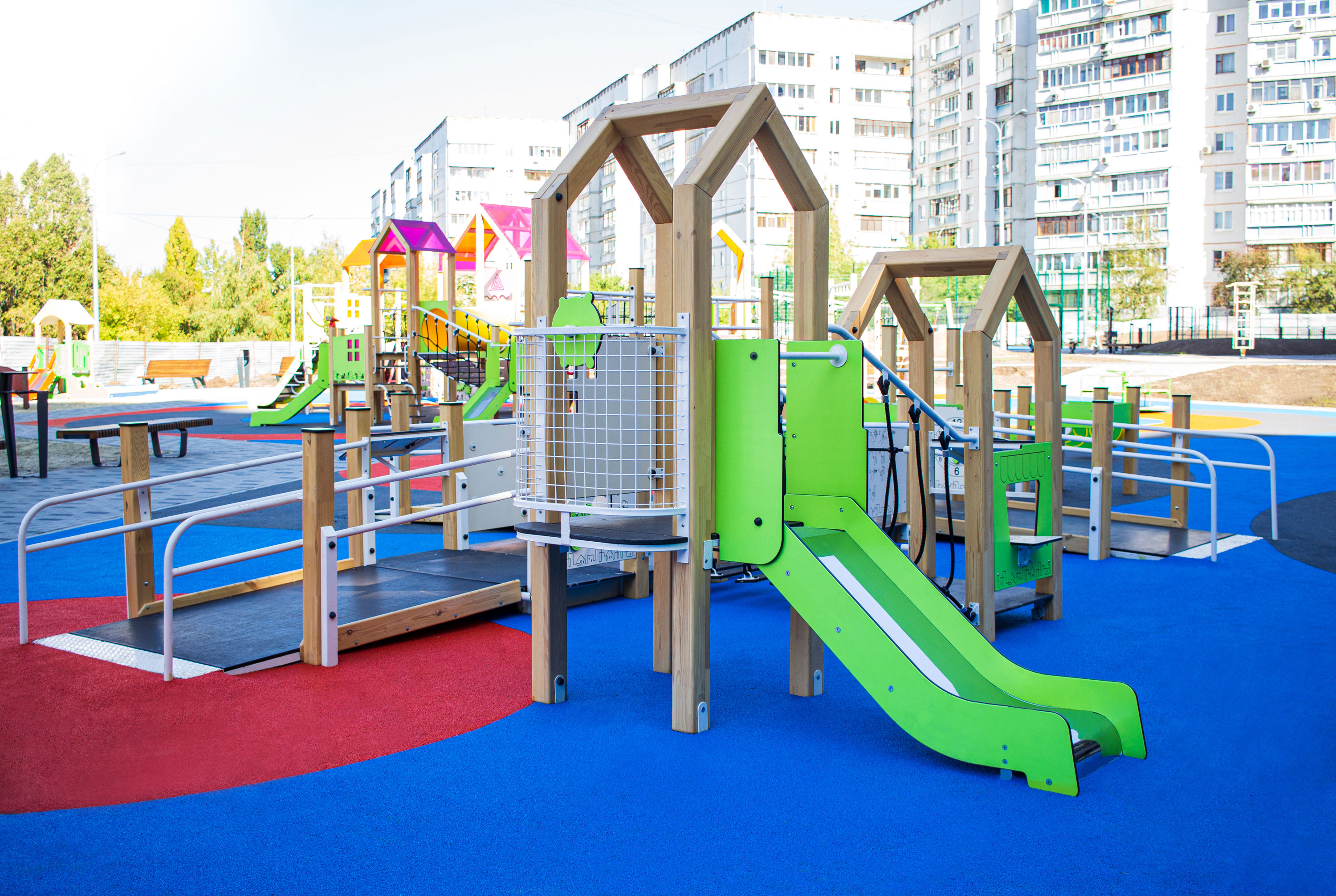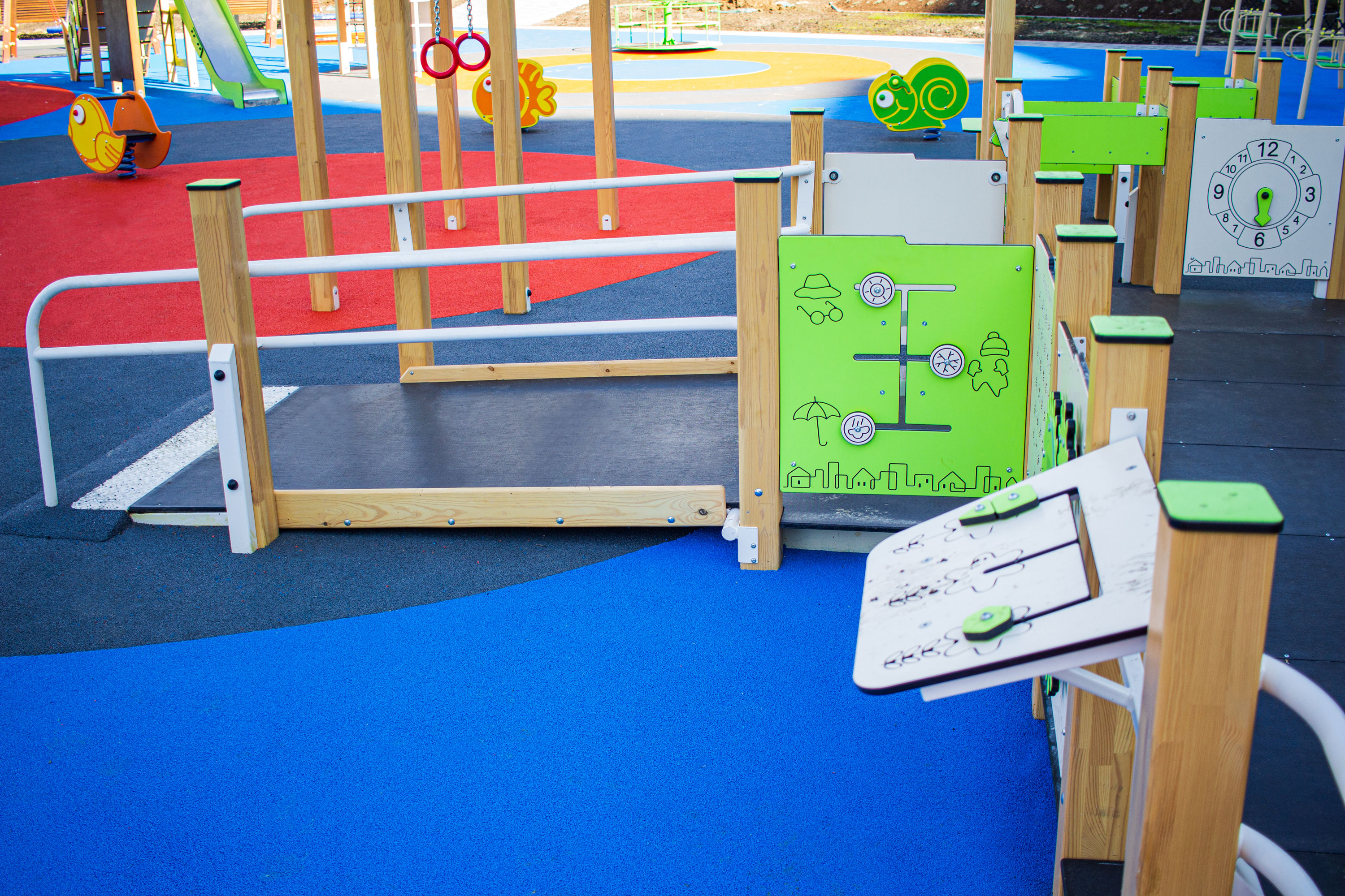 Steading Playground Complex for children with disabilities Interatletika TE835 is an inclusive, one-of-a-kind play complex, fully adapted for children with physical disabilities, and is created following regulations and quality standards. The equipment will become an exciting place for all children to play without exception.