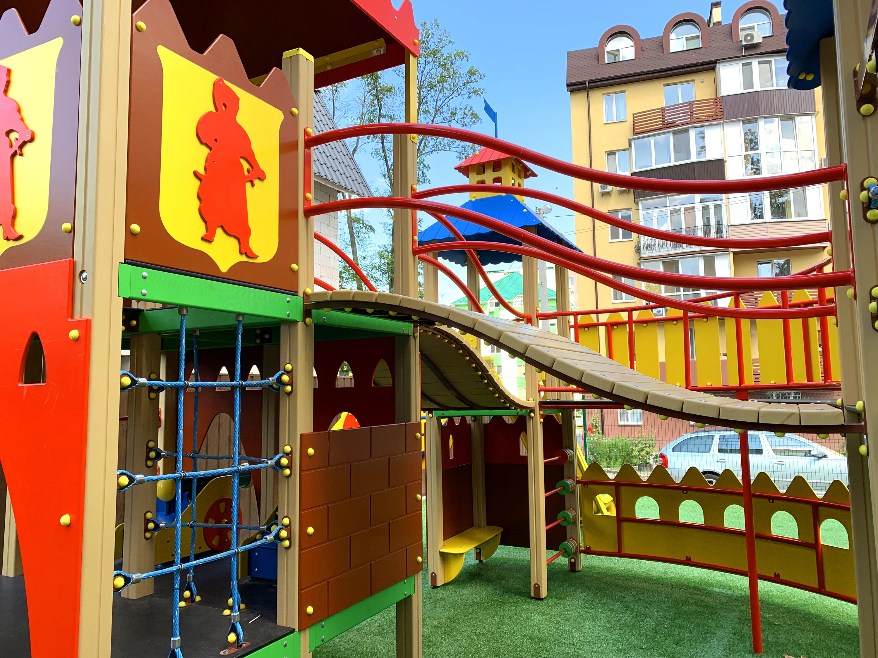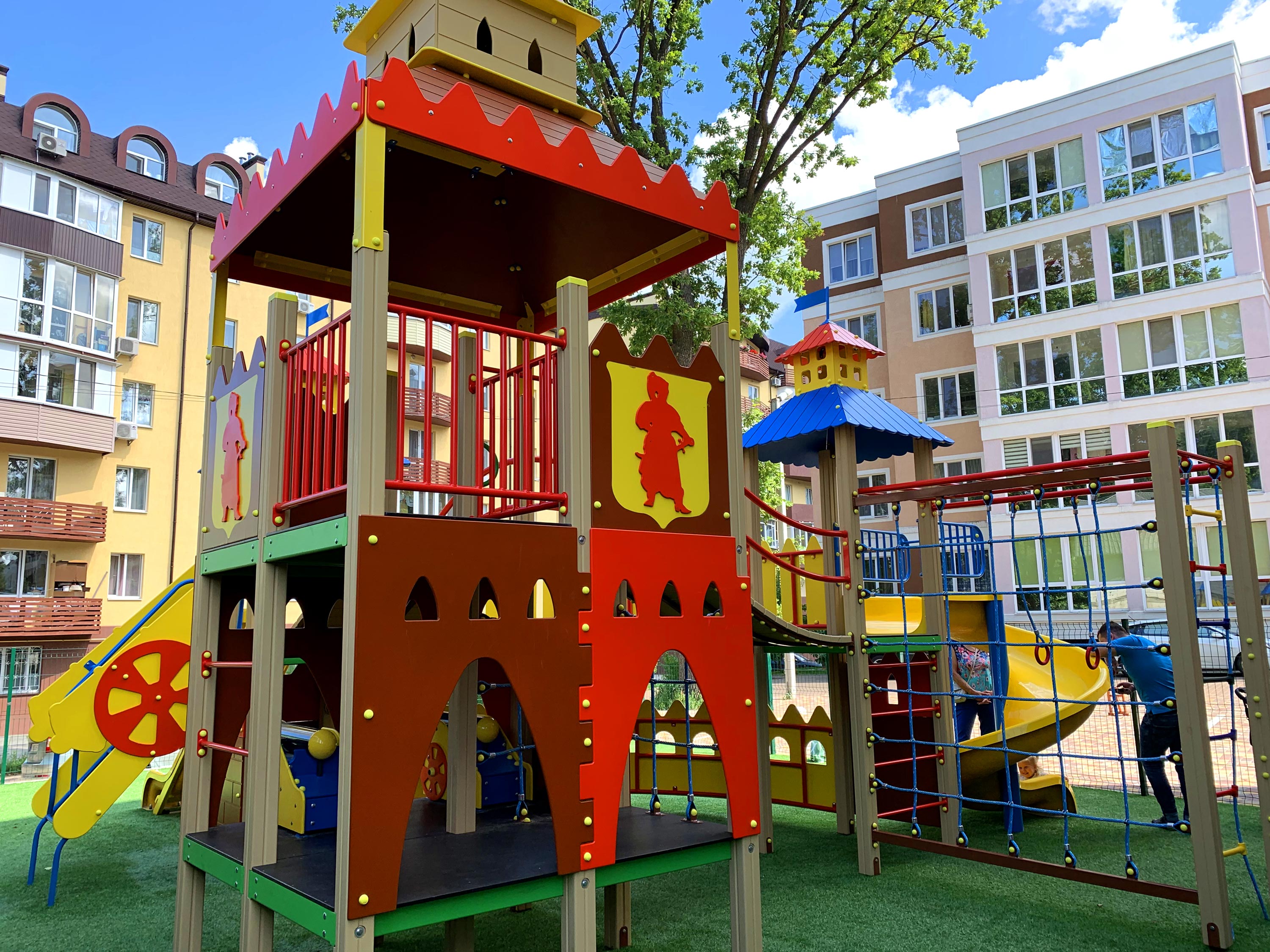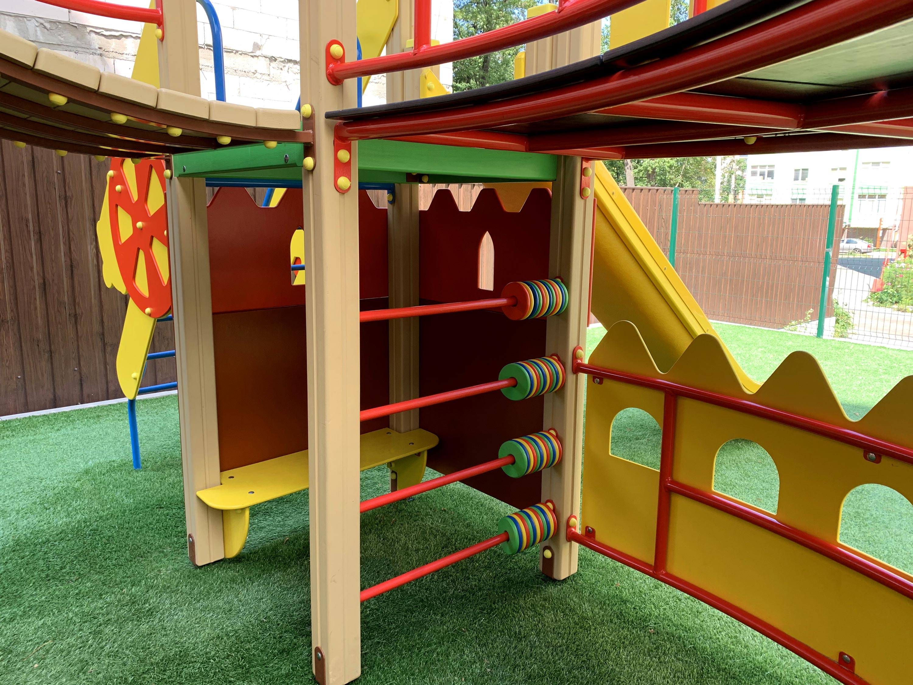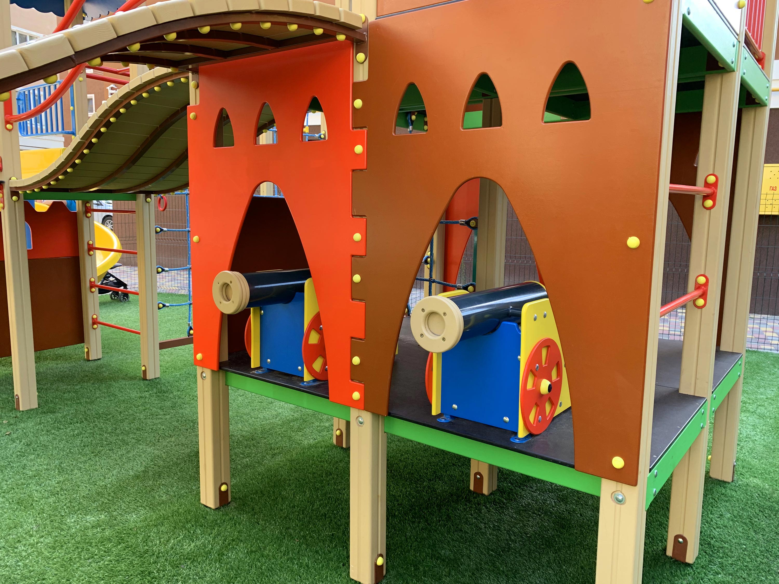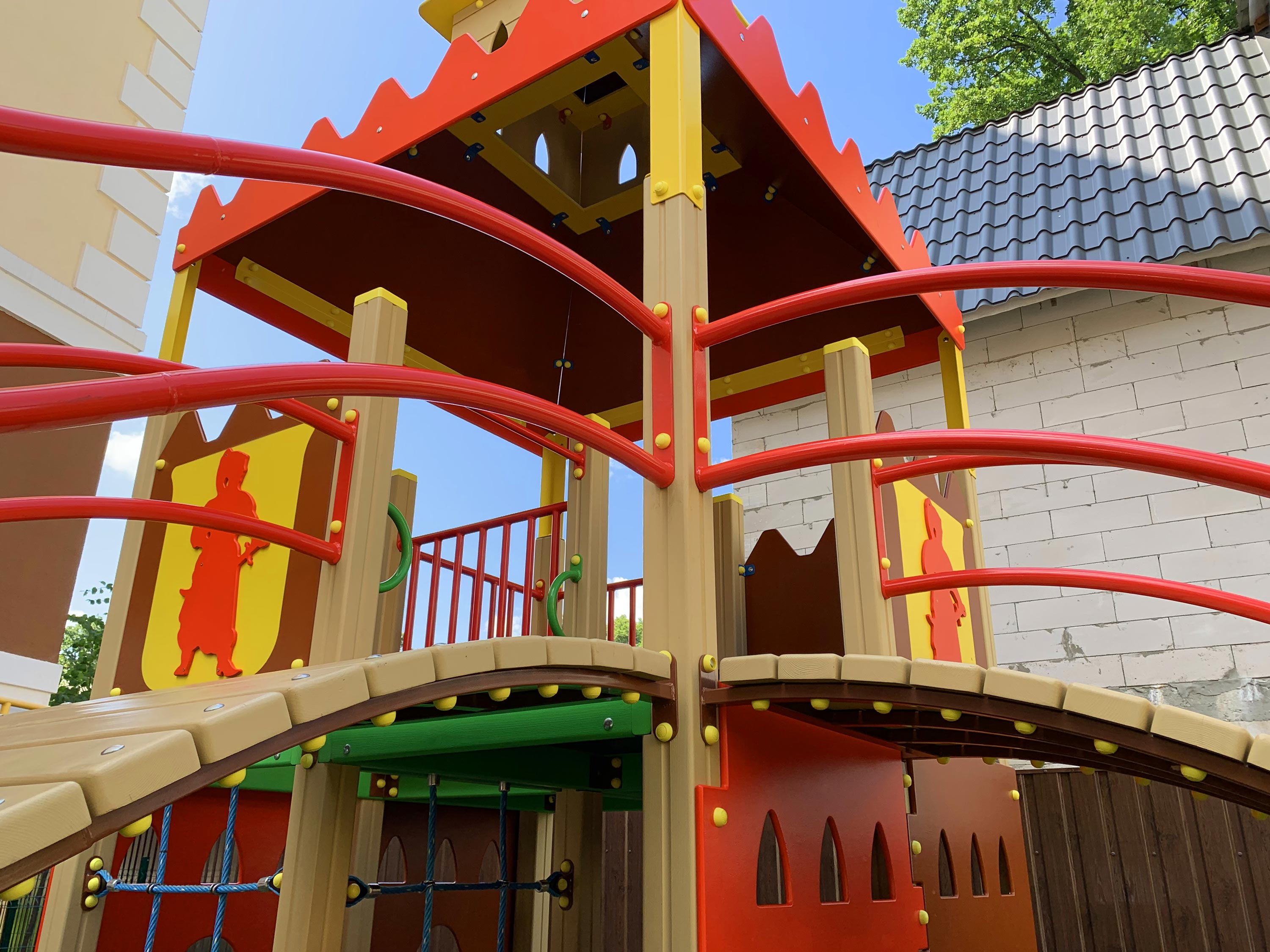 На двух этажах удобно и компактно укомплектовано все то, что любят дети всех возрастов: кольца, канатный комплекс, три башни с переходами, рукоход, подвесная лесенка, счеты для самых маленьких, пушки-игрушки и, конечно, любимые две горки - прямая и волнистая.