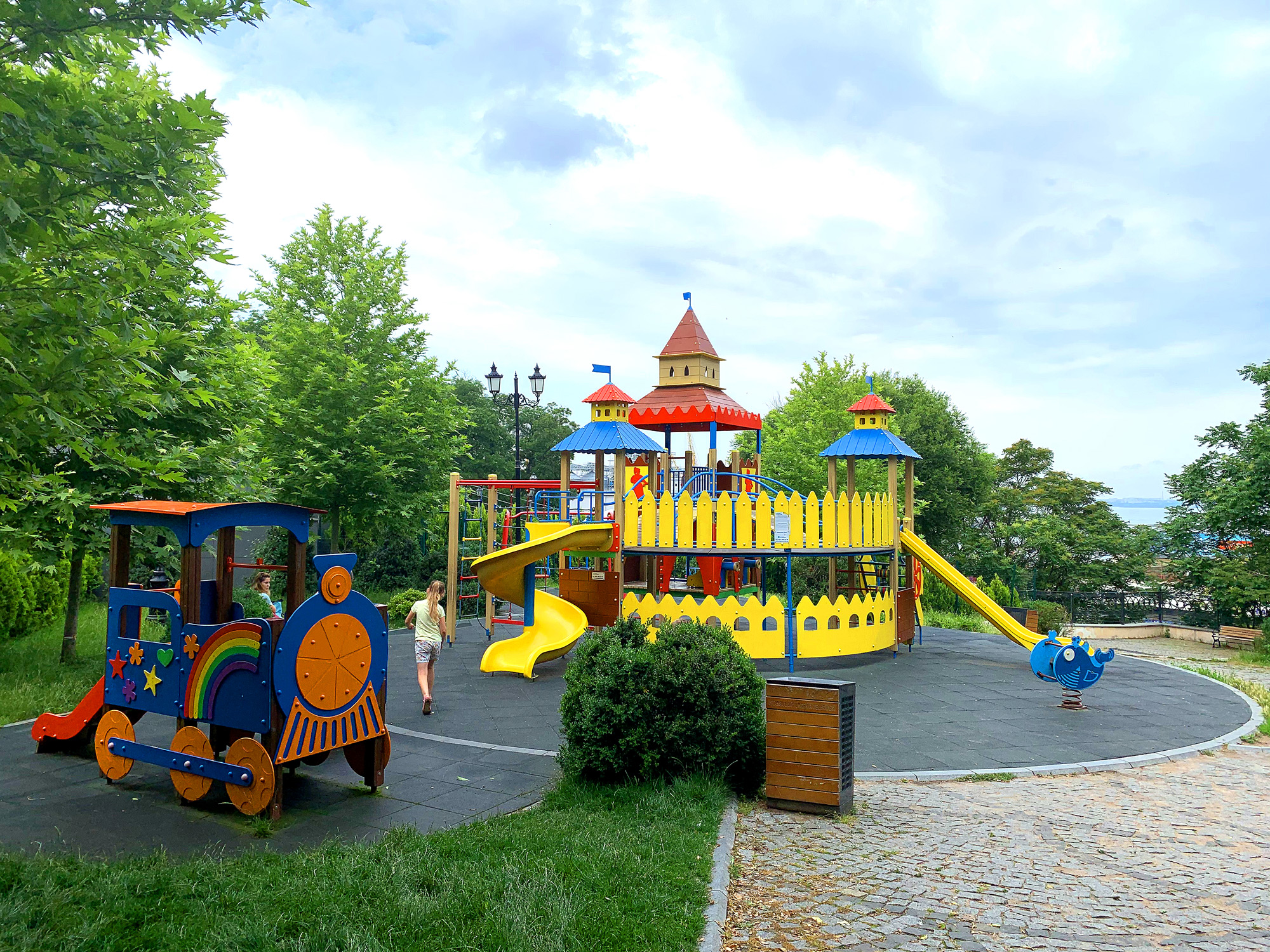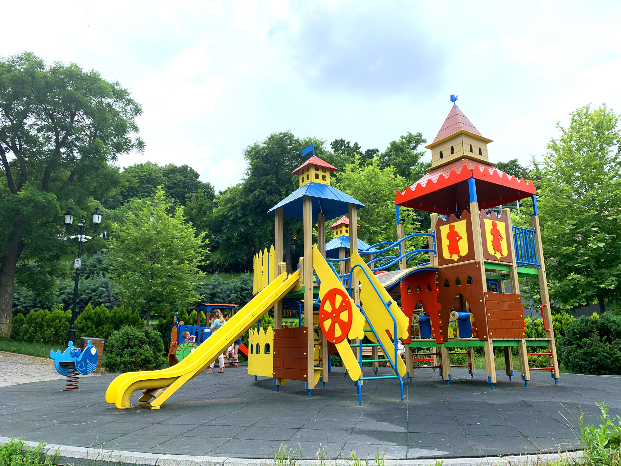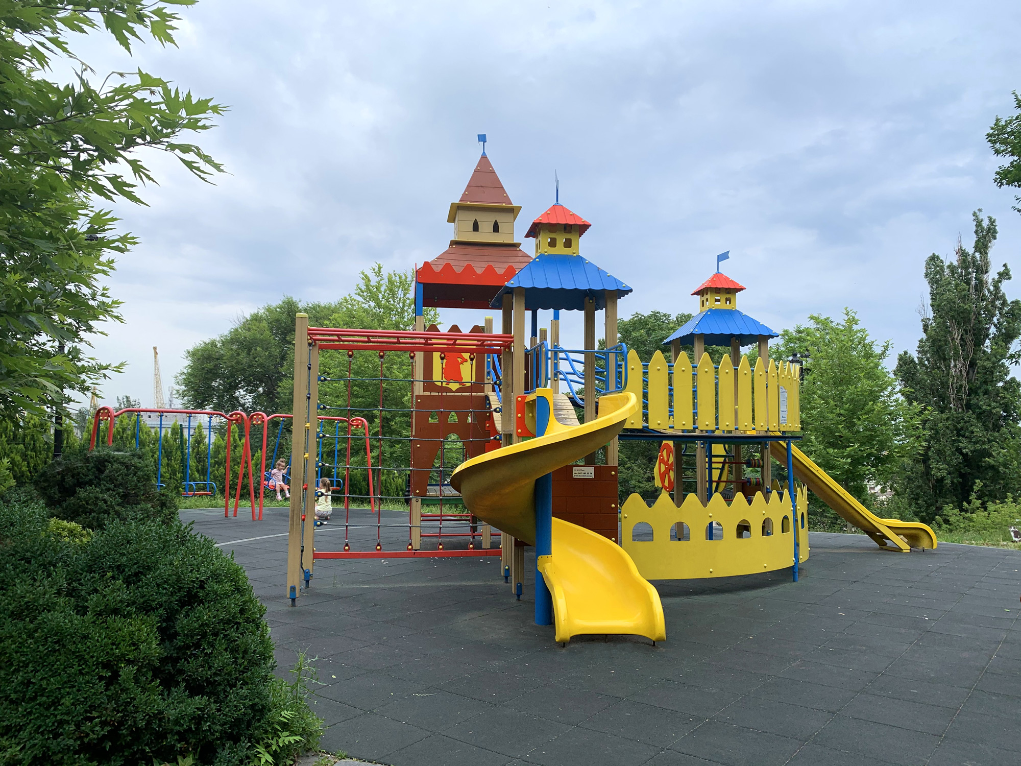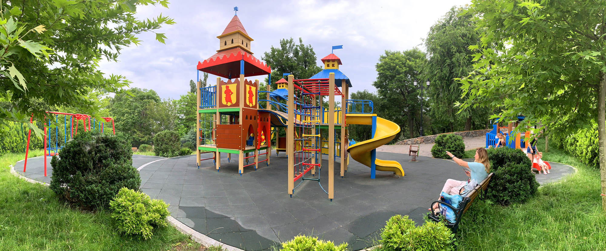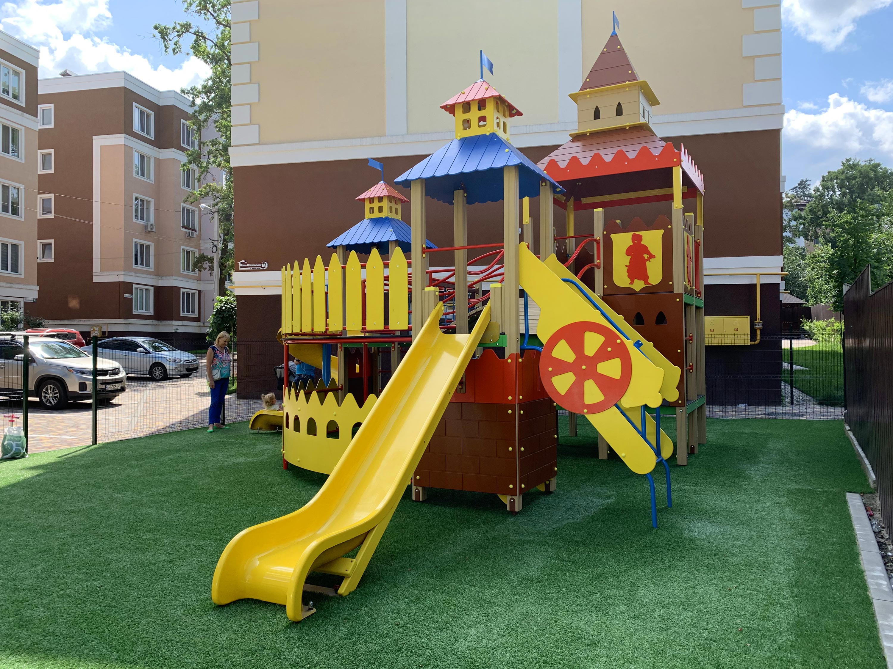 На двух этажах удобно и компактно укомплектовано все то, что любят дети всех возрастов: кольца, канатный комплекс, три башни с переходами, рукоход, подвесная лесенка, счеты для самых маленьких, пушки-игрушки и, конечно, любимые две горки - прямая и волнистая.