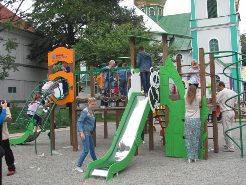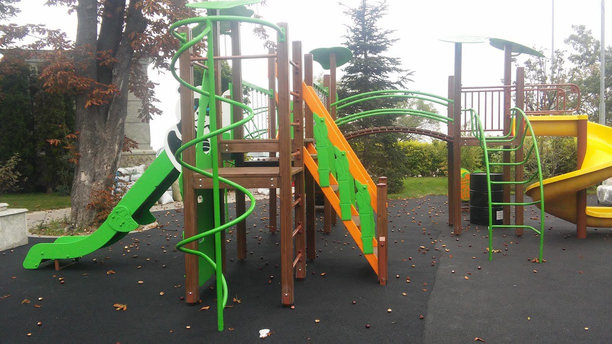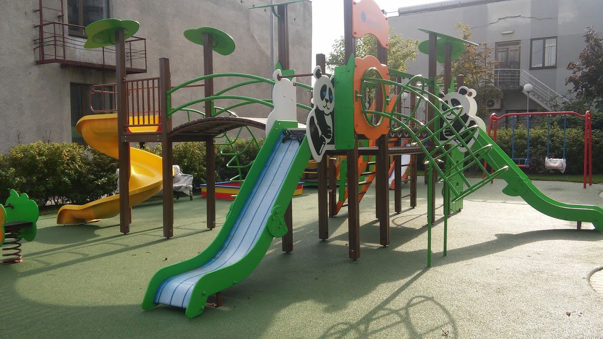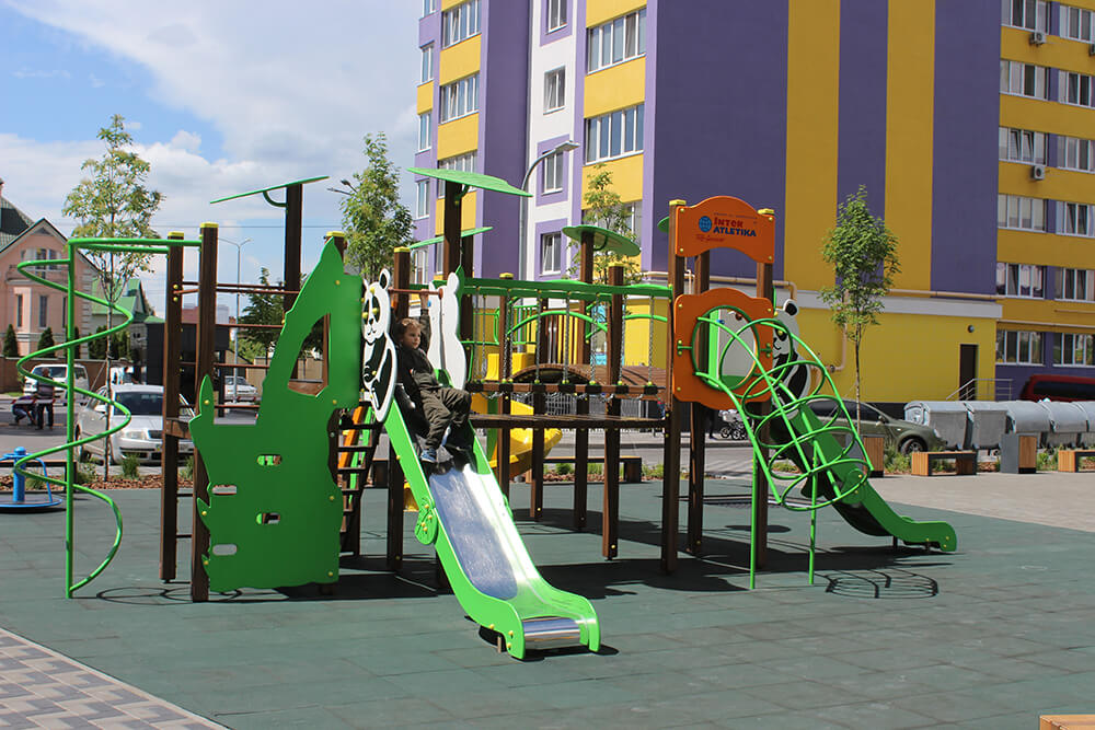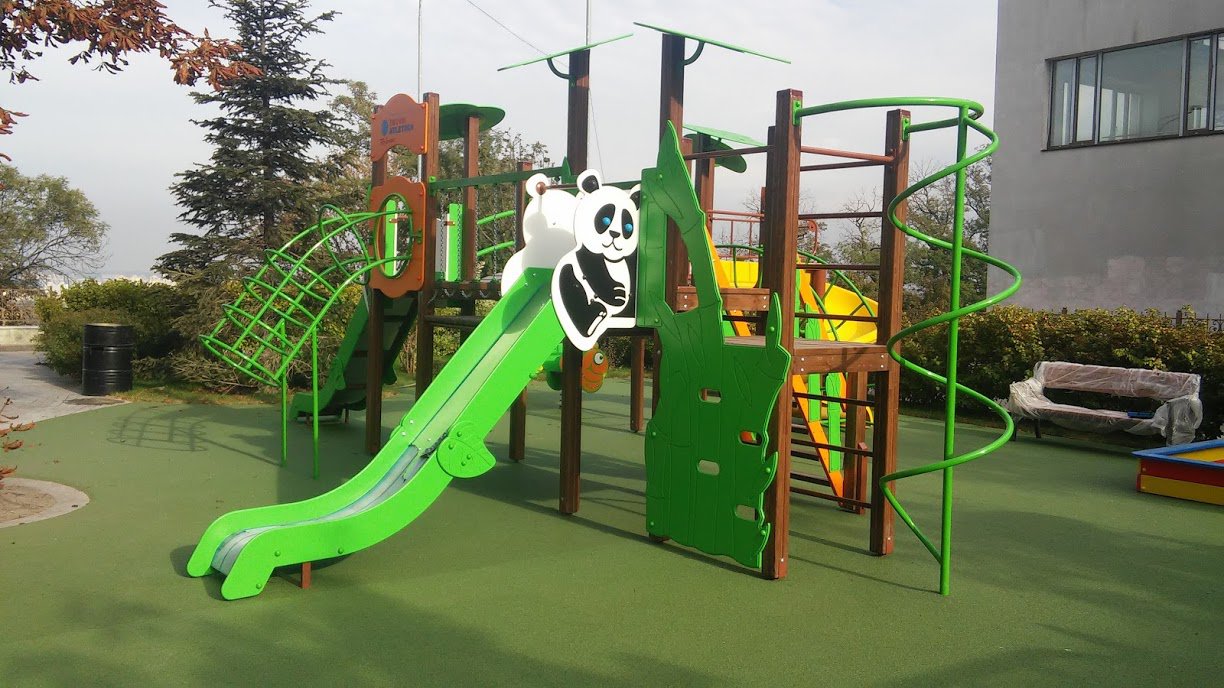 This playground with creative slides, stairs, obstacles, and cute design easily will become a favourite place for kids. They may play here, speak with each other, and have a pleasant pastime. Panda M Playground Complex Interatletika T907.2M boosts their physical, social, and emotional development. Images of a panda attract kids’ attention from a distance.