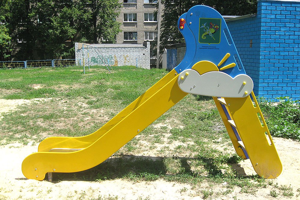 This bright and attractive slide has a smooth safe descent, which is made of stainless steel. The stairs and protective boards on the sides of the slope are made of moisture-resistant plywood and painted with water-based paints. Strong and made in Ukraine metal covered with anti-corrosion paints is used.