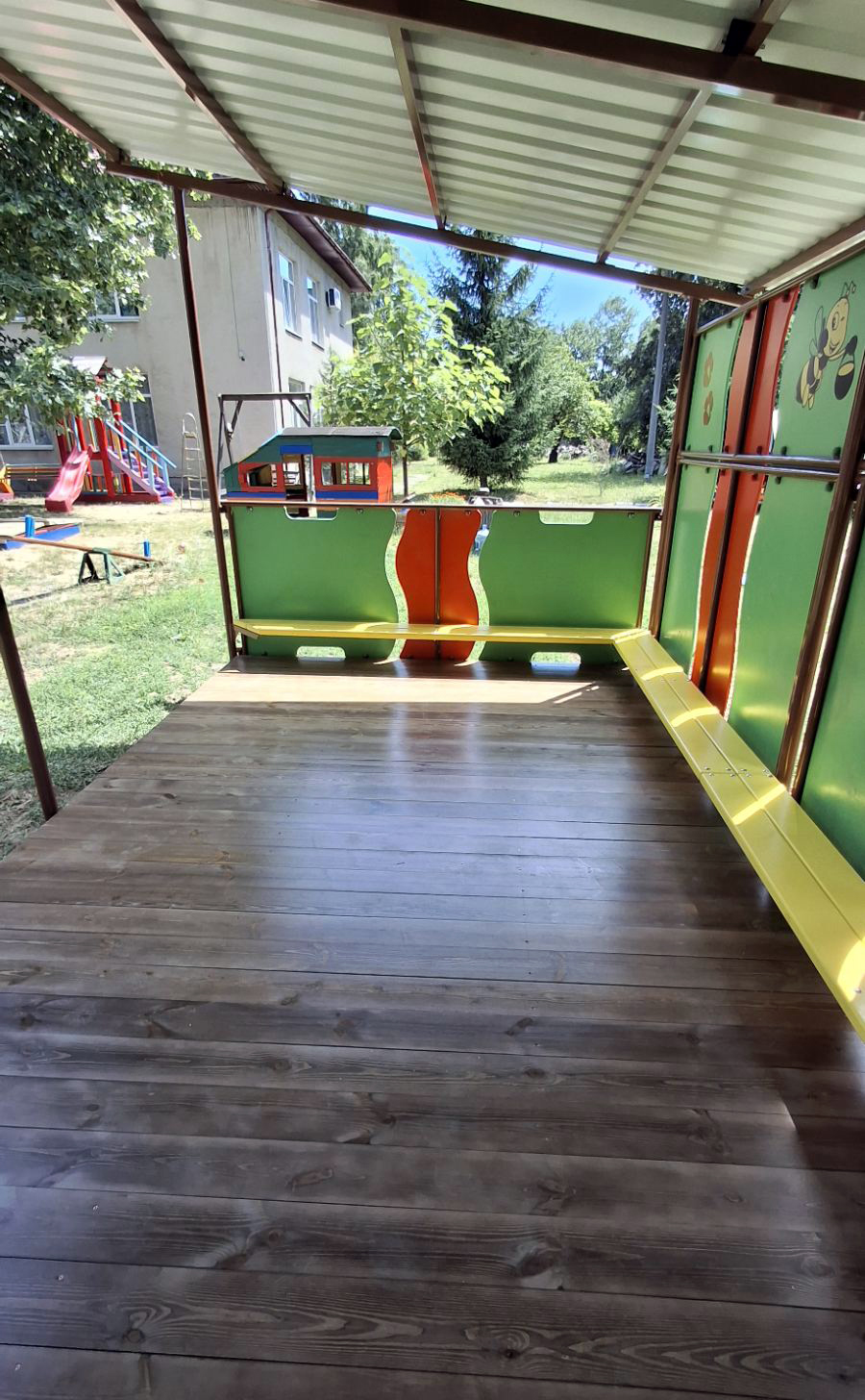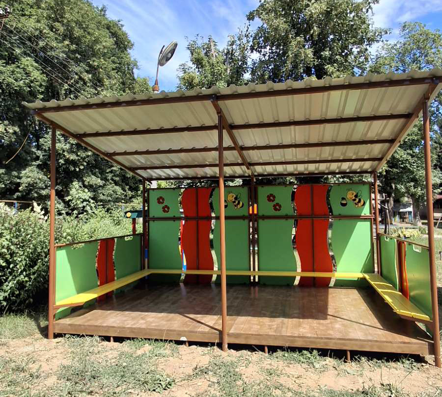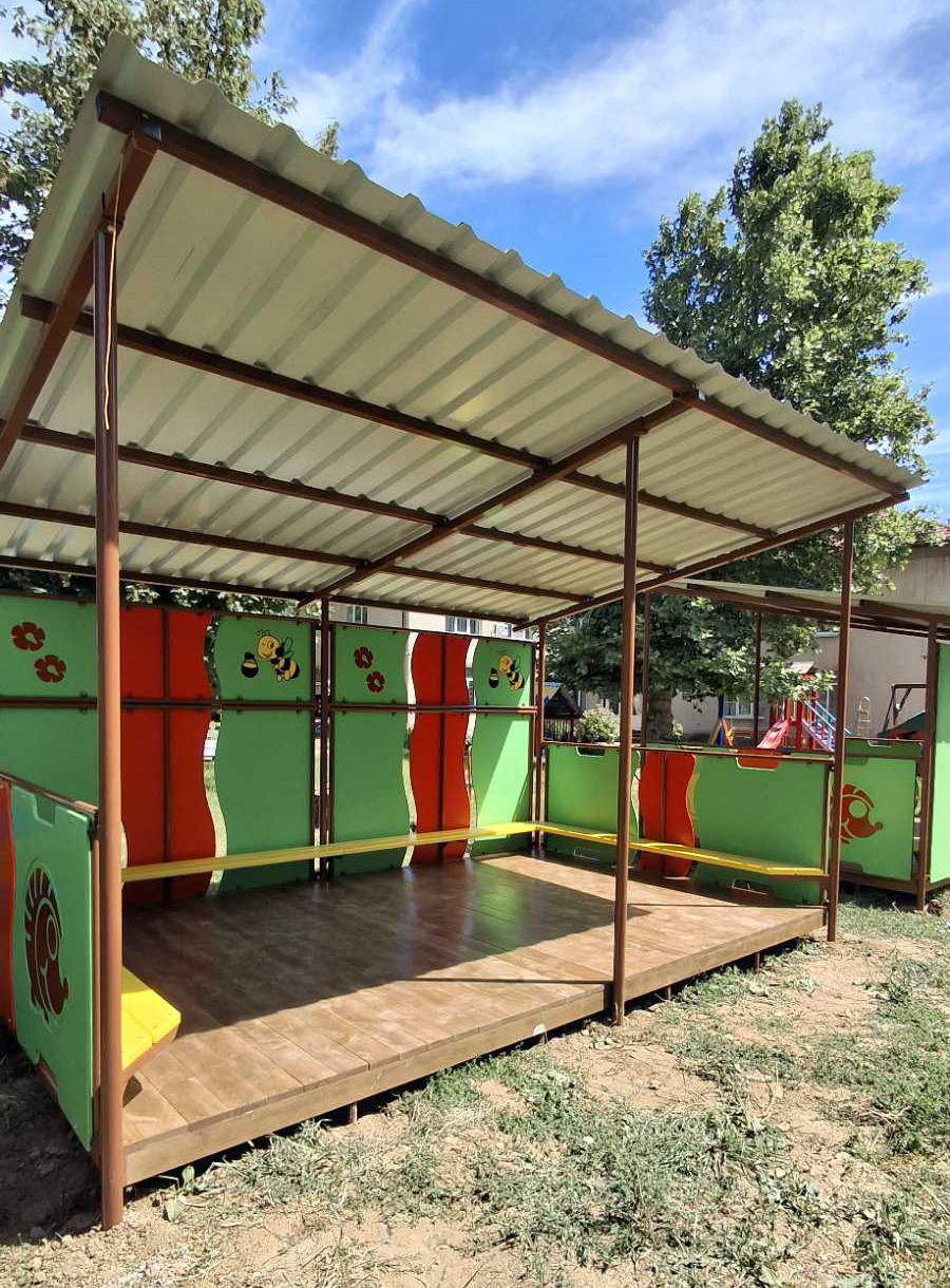Summer house with flooring (gazebo) InterAtletika is the perfect solution for creating comfortable and safe recreation area on playgrounds. Create a real oasis for games and fun, where every child can enjoy sunny days in the shade or hide from sudden precipitation, and parents can be calm about their safety. This model is equipped with flooring, which adds extra comfort and cosiness.