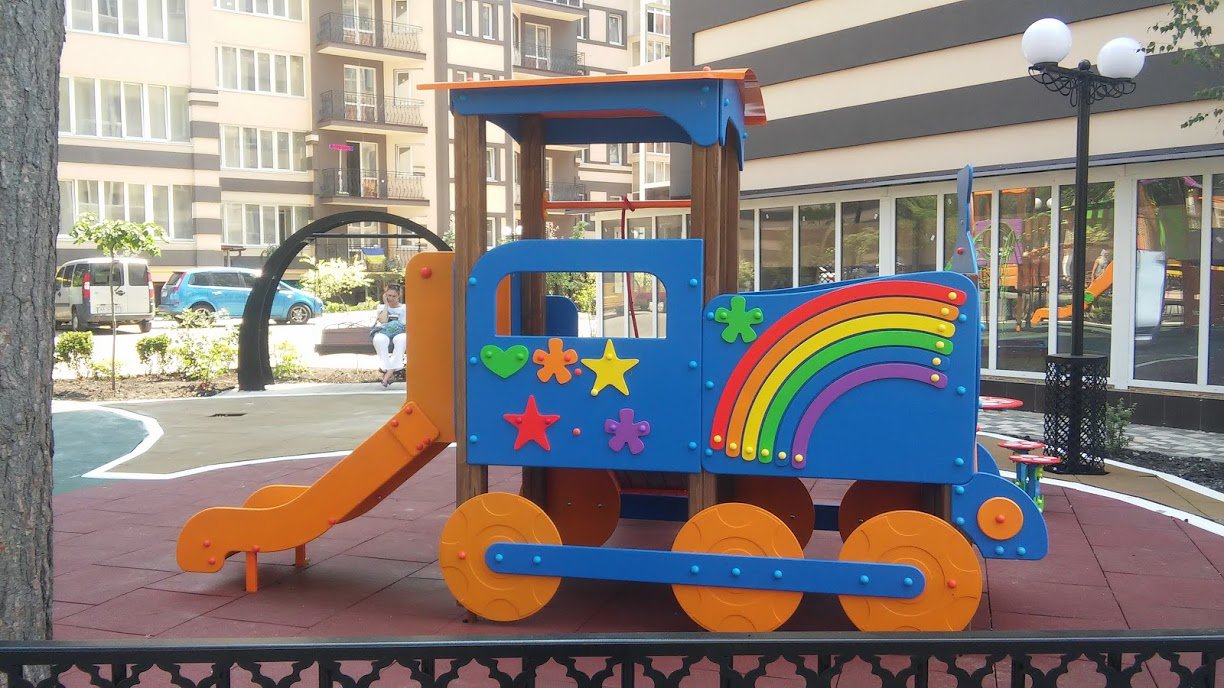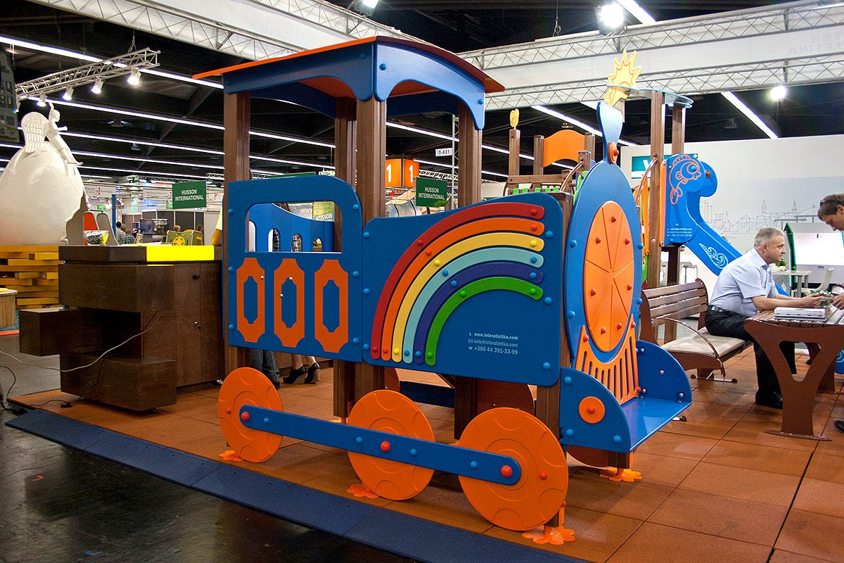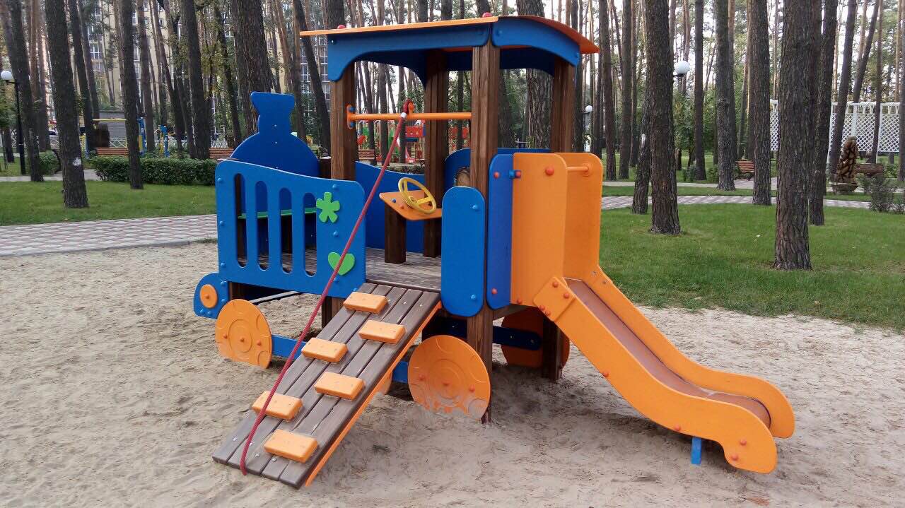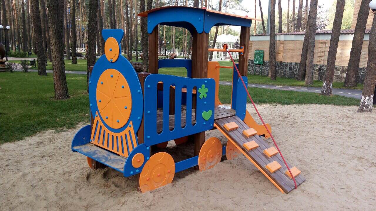 We offer to your attention a wonderful children's game element Happy Locomotive With A Slide Interatletika TE512. Many children will want to ride on this fabulous game train. A children's slide is added to the locomotive because it’s an indispensable attribute of any playground. The appearance has very bright colours, which will make it the most colourful and attractive kid equipment in your yard, school, kindergarten, or in the playground.