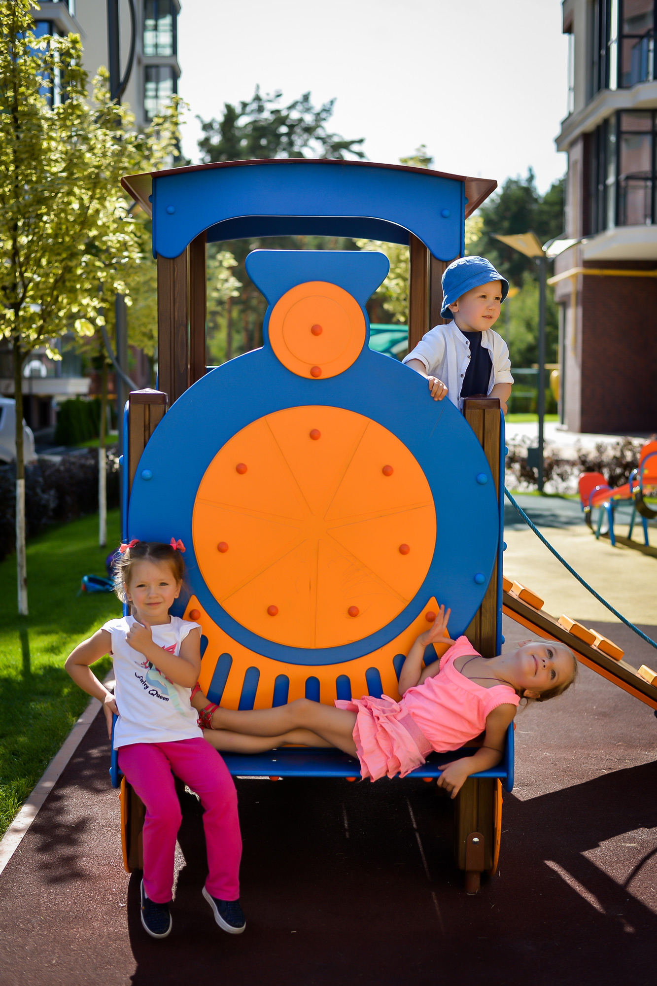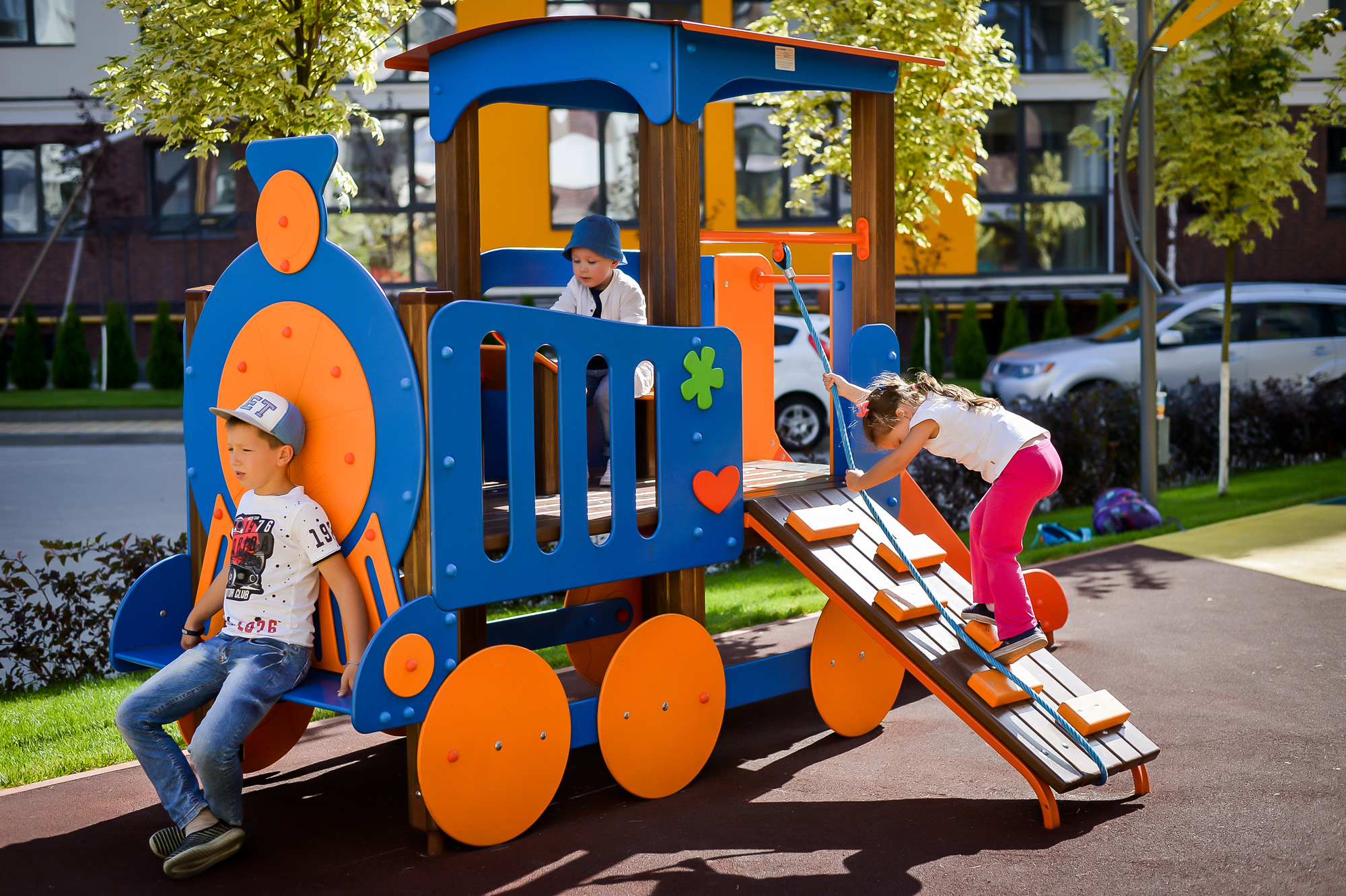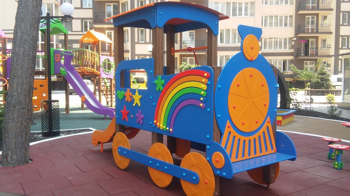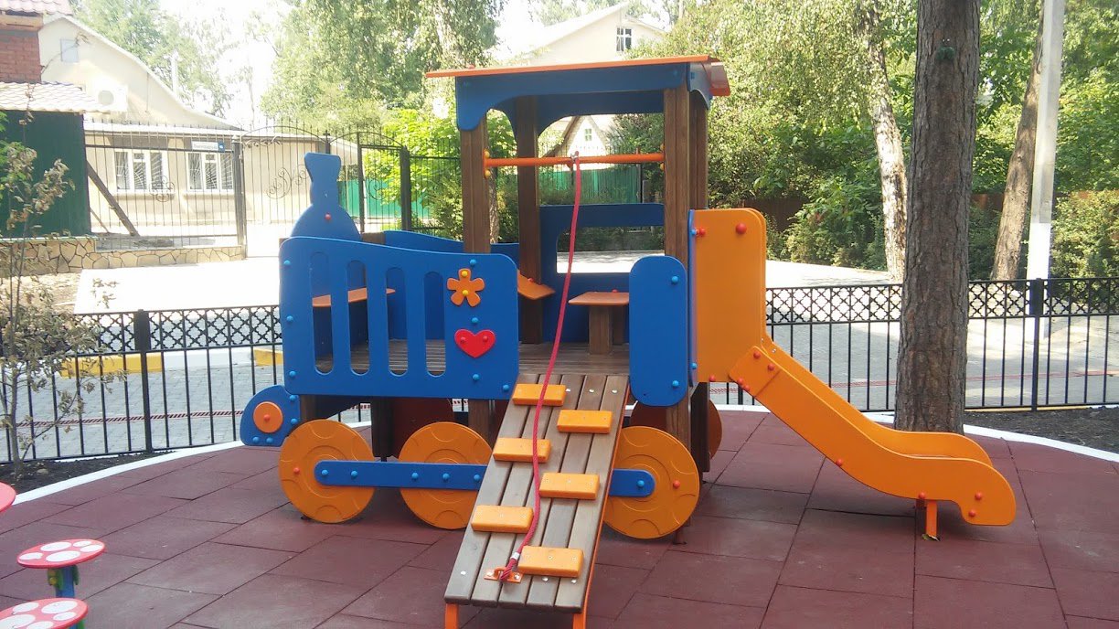 We offer to your attention a wonderful children's game element Happy Locomotive With A Slide Interatletika TE512. Many children will want to ride on this fabulous game train. A children's slide is added to the locomotive because it’s an indispensable attribute of any playground. The appearance has very bright colours, which will make it the most colourful and attractive kid equipment in your yard, school, kindergarten, or in the playground.