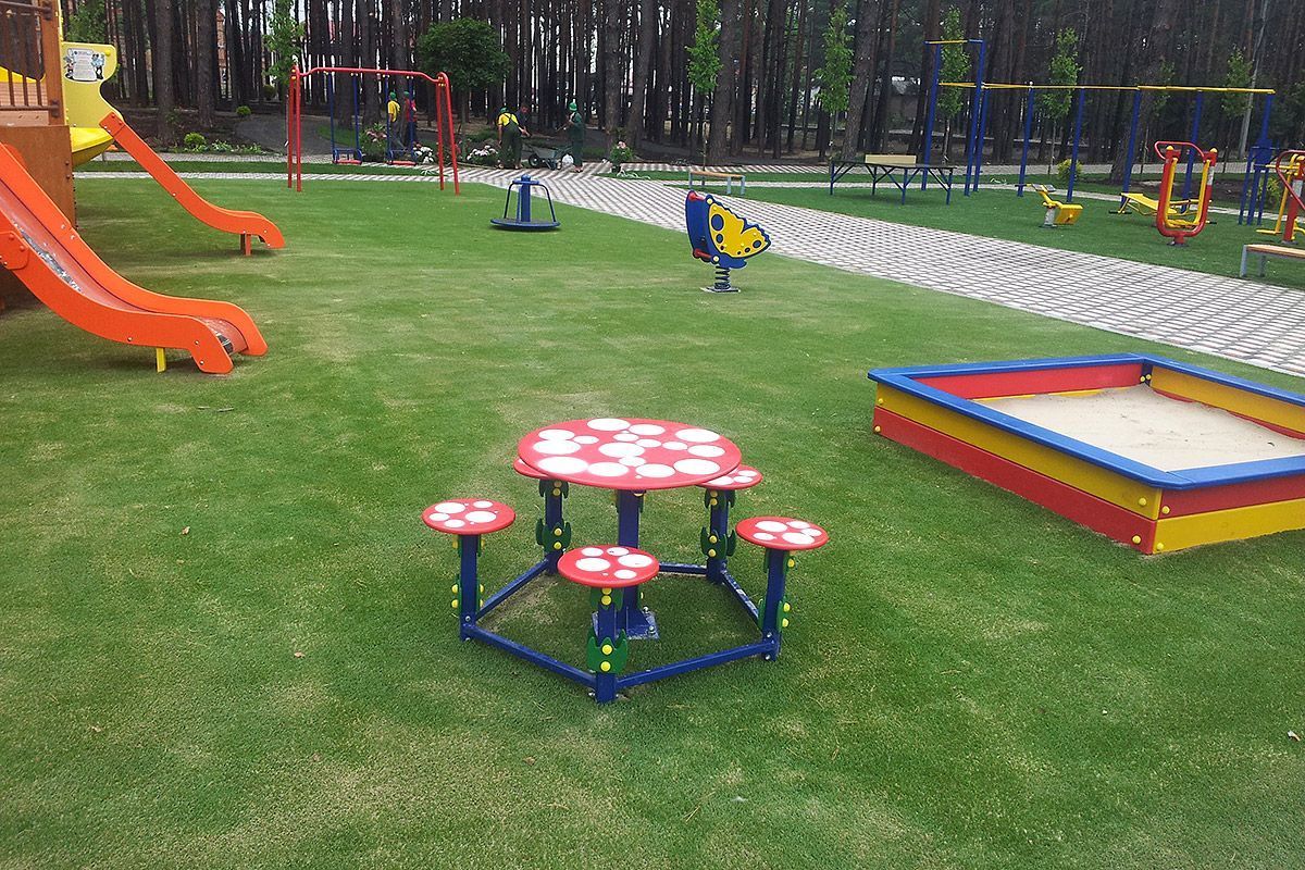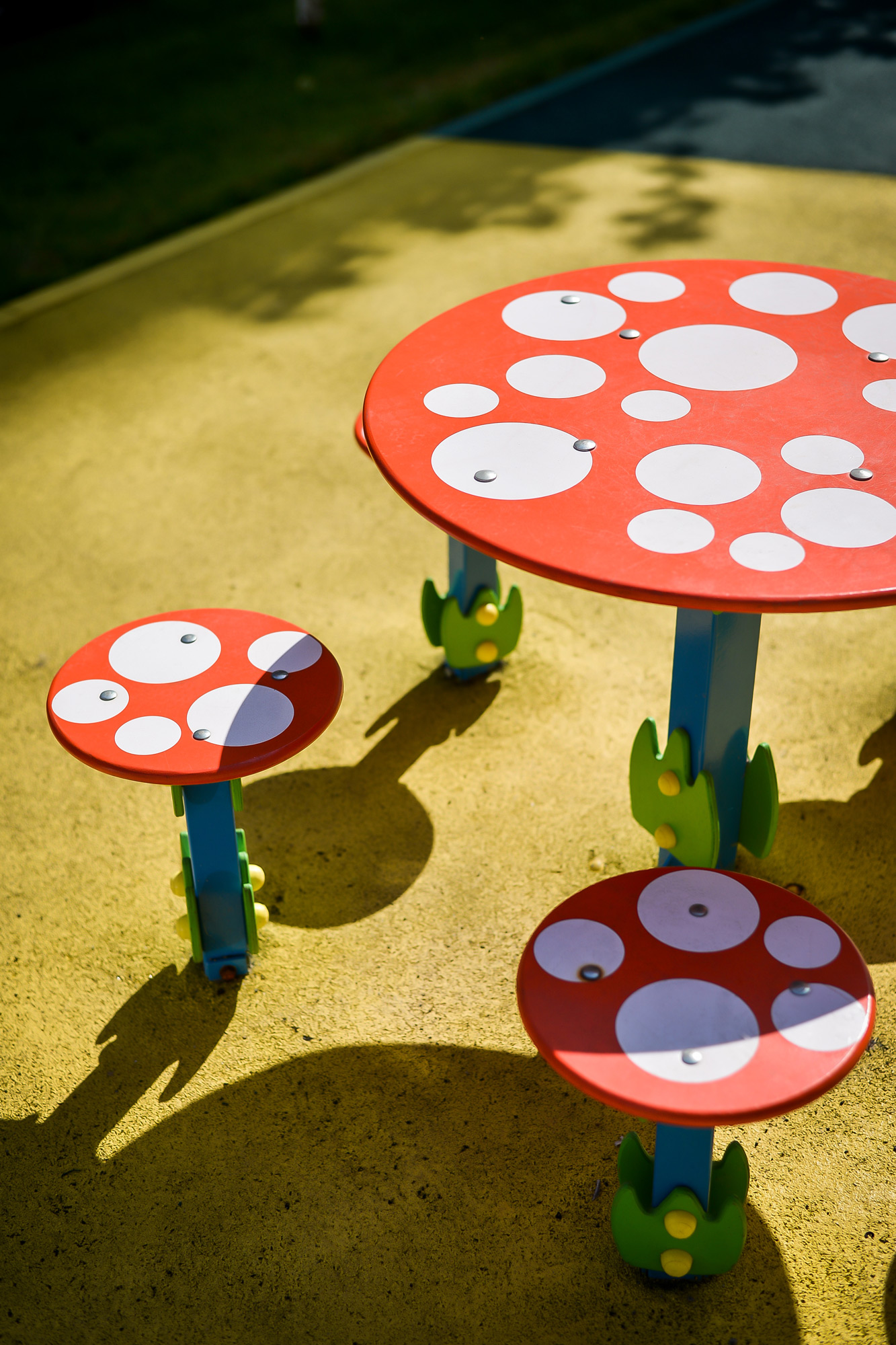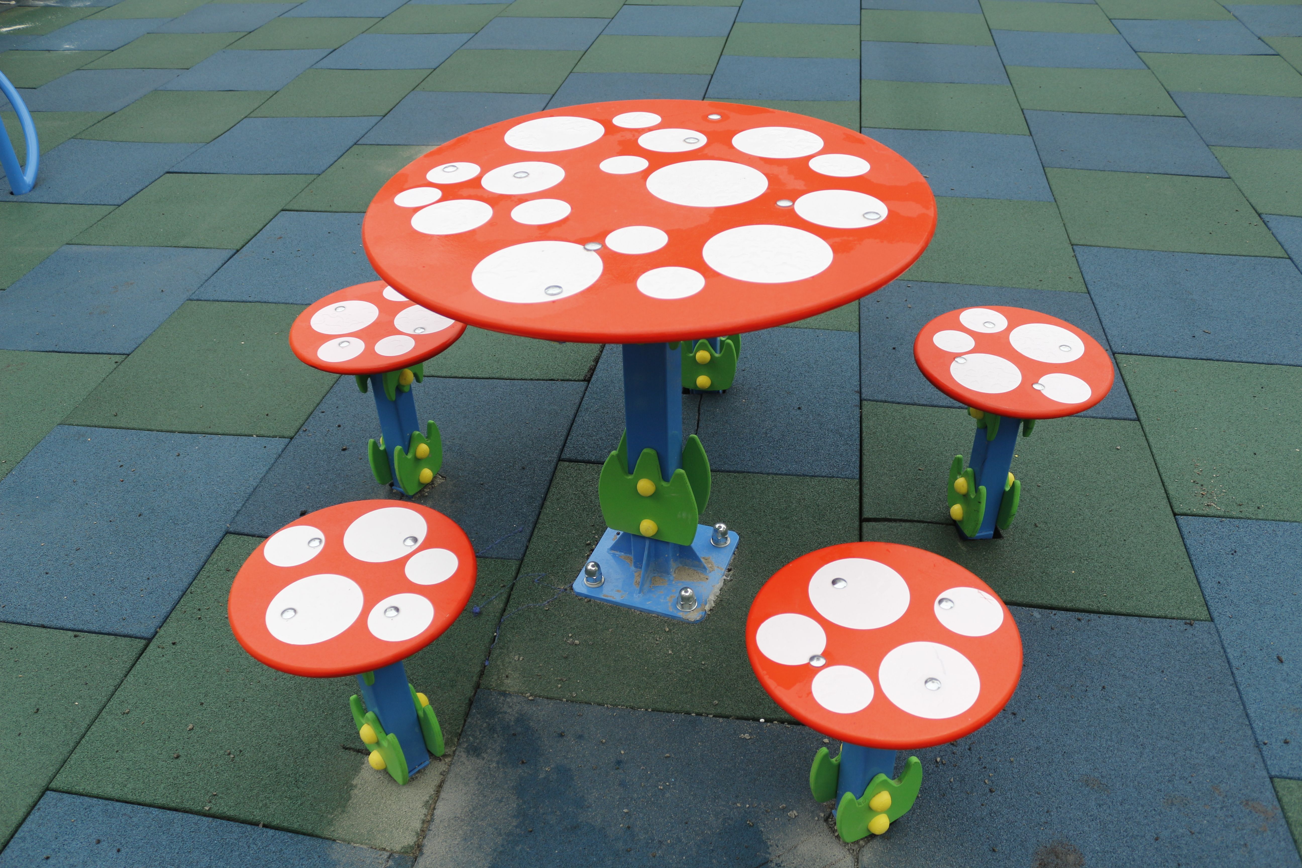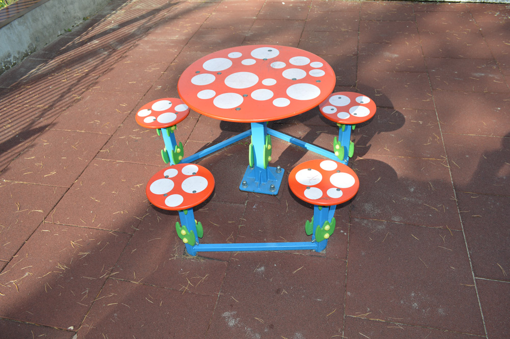 Mushroom Table Interatletika ТЕ313 will serve your children as an excellent place for board games. This set is designed for a small company of kids and includes a table and five round chairs. The bright colours, in which the table is painted, will appeal to every child, and at the same time, they will fit perfectly into the general landscape.