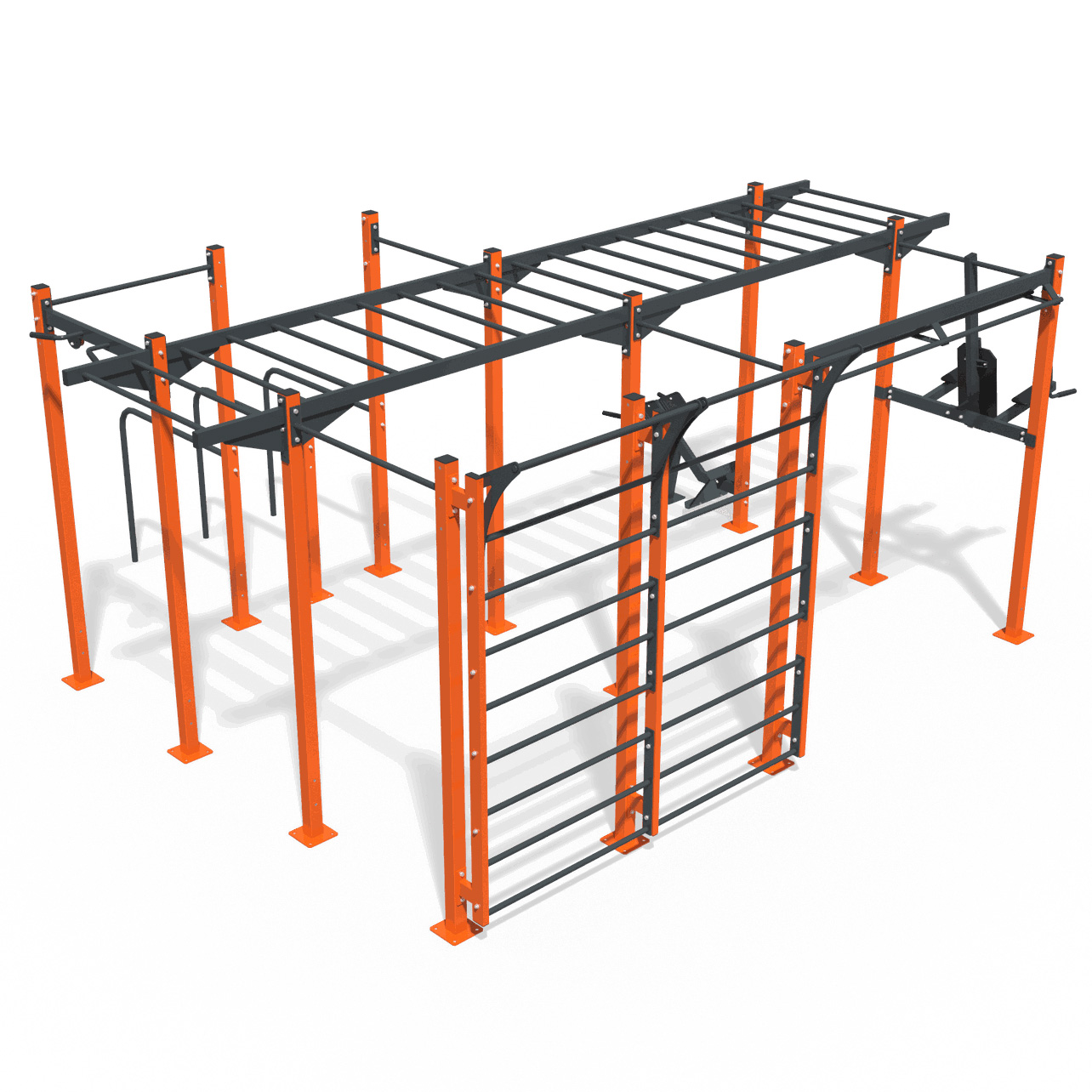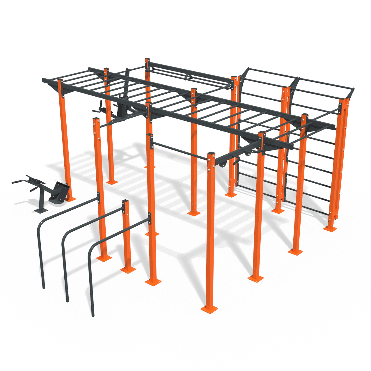 Sports complex Workout Interatletika KF902.24 is designed for functional outdoor training and development of all muscle groups. The complex consists of a combination of sports elements that are attached to the racks. Horizontal bars, monkey bar, ladder, hyperextension, parallel bars allow you to perform a variety of exercises.